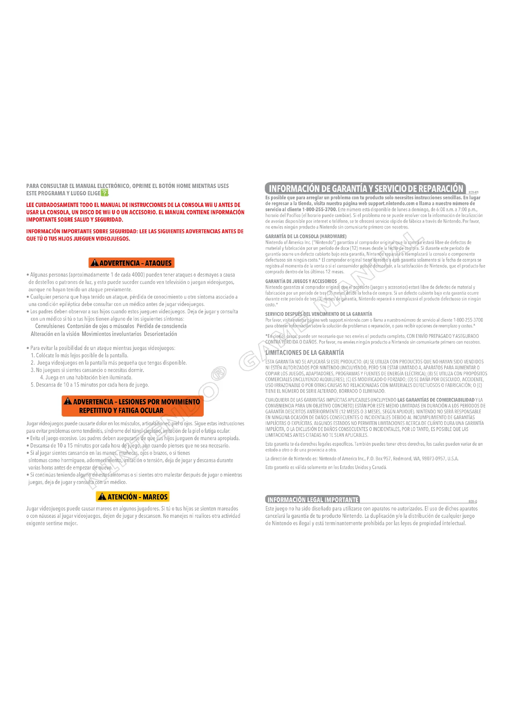 LEE CUIDADOSAMENTE TODO EL MANUAL DE INSTRUCCIONES DE LA CONSOLA Wii U ANTES DE USAR LA CONSOLA, UN DISCO DE Wii U O UN ACCESORIO. EL MANUAL CONTIENE INFORMACIÓN IMPORTANTE SOBRE SALUD Y SEGURIDAD. INFORMACIÓN IMPORTANTE SOBRE SEGURIDAD: LEE LAS SIGUIENTES ADVERTENCIAS ANTES DE QUE TÚ O TUS HIJOS JUEGUEN VIDEOJUEGOS.