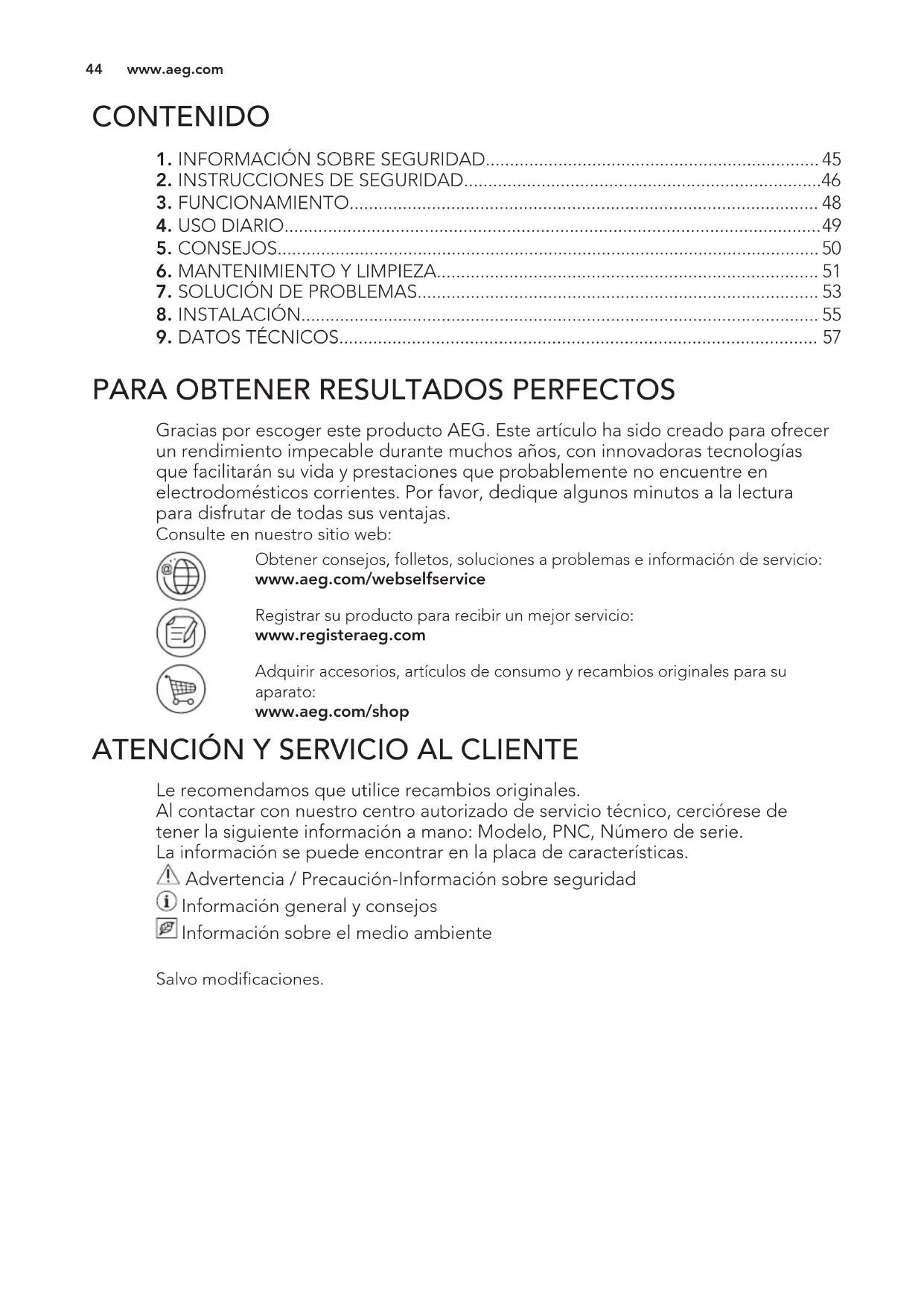 Gracias por escoger este producto AEG. Este artículo ha sido creado para ofrecer un rendimiento impecable durante muchos años, con innovadoras tecnologías que facilitarán su vida y prestaciones que probablemente no encuentre en electrodomésticos corrientes. Por favor, dedique algunos minutos a la lectura para disfrutar de todas sus ventajas. Consulte en nuestro sitio web: Obtener consejos, folletos, soluciones a problemas e información de servicio: www.aeg.com/webselfservice Registrar su producto para recibir un mejor servicio: www.registeraeg.com Adquirir accesorios, artículos de consumo y recambios originales para su aparato: www.aeg.com/shop