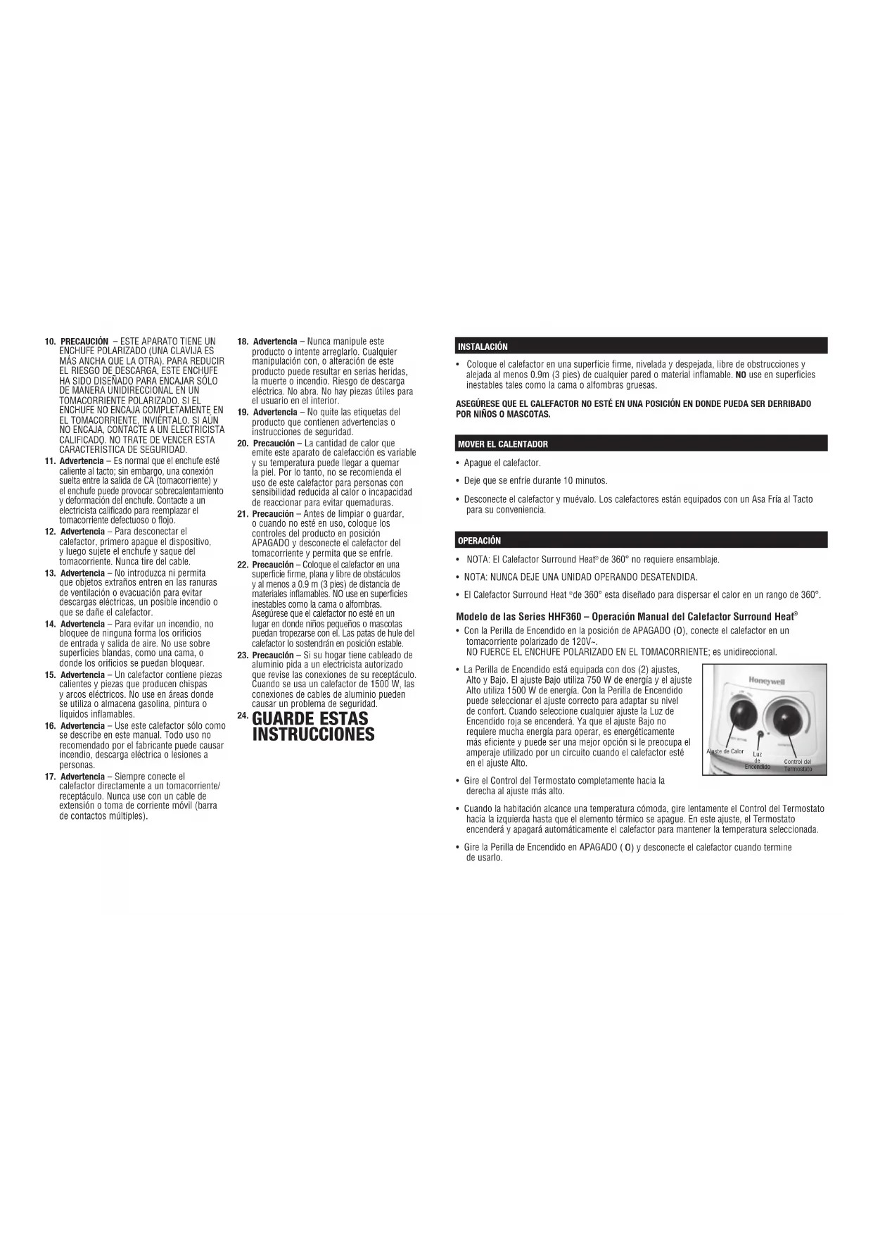 Este dispositivo cumple con la Parte 15 de las Normas de la FCC. La operación está sujeta a las dos condiciones siguientes: (1) Este dispositivo no puede causar interferencia dañina y (2) Este dispositivo debe aceptar cualquier interferencia recibida, incluida interferencia que pueda causar una operación no deseada.Spot Colors Brand: Honeywell Category: tri-lingual owners manual Models: HHF360/370 Series Oracle Desc. : Subject: Heater Artwork Part #’s: 31IMH367190 Die Line Part #: NA OM, HHF360/370 SURROUND SERIES,