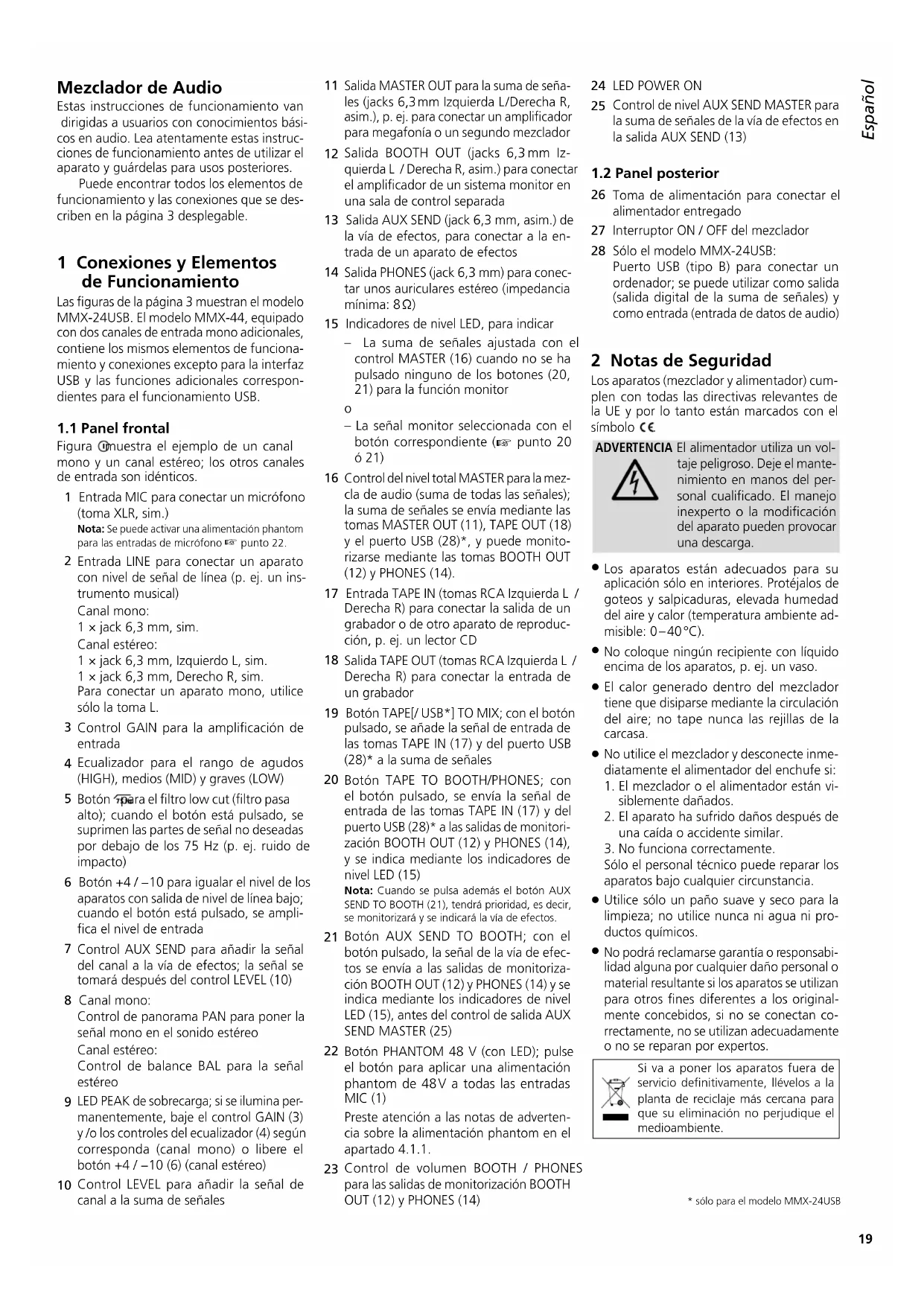 No podrá reclamarse garantía o responsabi- lidad alguna por cualquier daño personal o material resultante si los aparatos se utilizan para otros fines diferentes a los original- mente concebidos, si no se conectan co- rrectamente, no se utilizan adecuadamente o no se reparan por expertos. Si va a poner los aparatos fuera de servicio definitivamente, llévelos a la planta de reciclaje más cercana para que su eliminación no perjudique el medioambiente.EspañolEspañol Página* sólo para el modelo MMX-24USB20 Español 3 Aplicaciones Este mezclador de audio está diseñado para megafonía universal y para grabaciones. Con-tiene 2 (MMX-24USB) o 4 (MMX-44) cana-les de entrada mono y 4 canales de entrada estéreo para conectar micrófonos (también alimentados por phantom) y fuentes de audio con salida de nivel de línea (p. ej. instrumentos musicales, lectores). Una vía de envíos permite el uso de un aparato de efectos. Además, hay conexiones disponibles para un grabador. La mezcla del audio se puede monitorizar me-diante auriculares y /o mediante un sistema monitor en una sala de control separada.El modelo MMX-24USB ofrece además una interfaz de audio USB para conectar un or-denador. 4 Puesta en Marcha del Mezclador de Audio Antes de la conexión / desconexión y antes del encendido, ponga siempre los controles de salida BOOTH / PHONES (23) y MASTER (16) en el mínimo.
