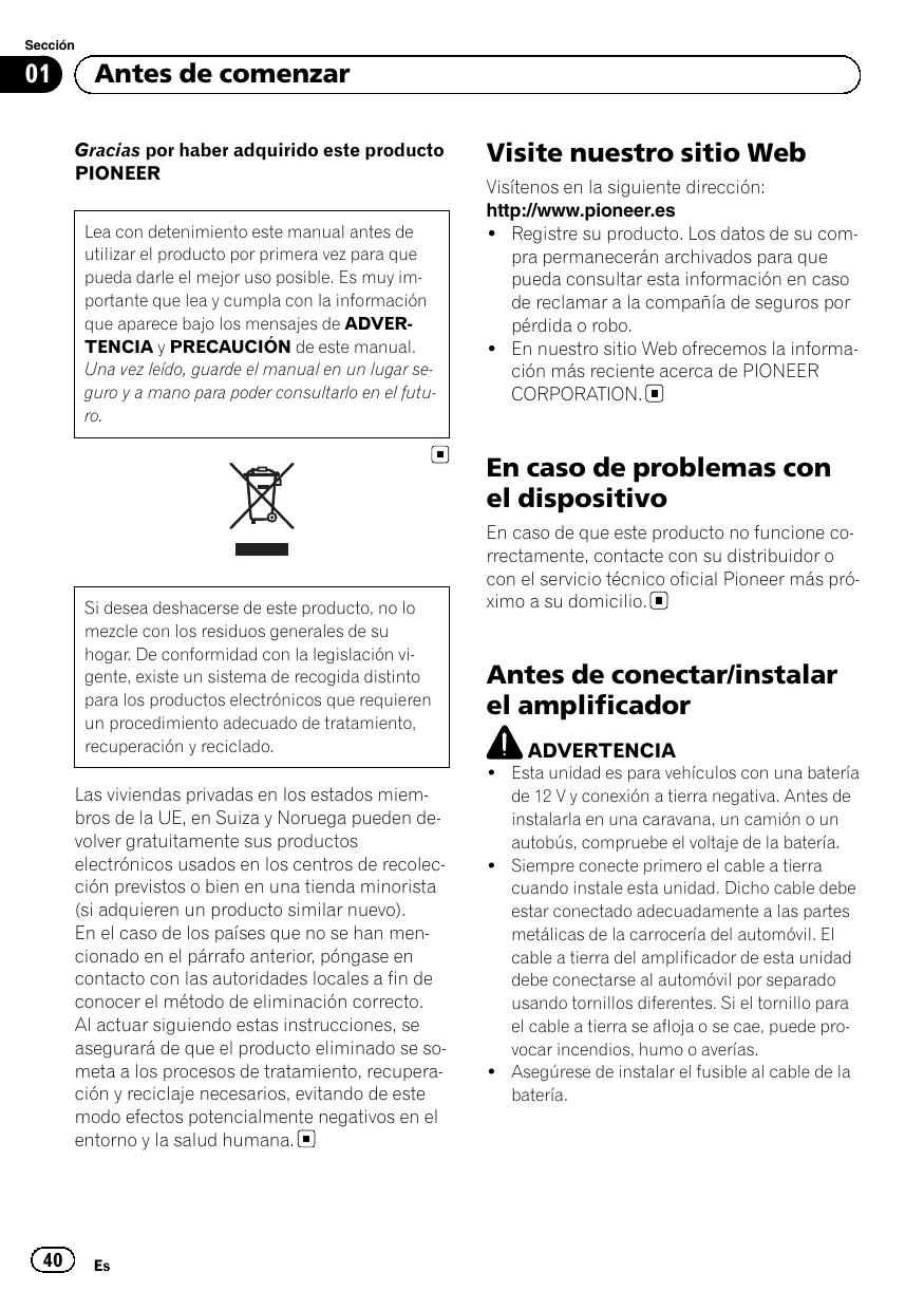 SCHAKELBARE 4-KANAALSVERSTERKER Français Antes de comenzar Gracias por haber adquirido este producto PIONEER Lea con detenimiento este manual antes de utilizar el producto por primera vez para que pueda darle el mejor uso posible. Es muy importante que lea y cumpla con la información que aparece bajo los mensajes de ADVERTENCIA y PRECAUCIÓN de este manual. Una vez leído, guarde el manual en un lugar seguro y a mano para poder consultarlo en el futuro. Visite nuestro sitio Web Visítenos en la siguiente dirección: http://www.pioneer.es ! Registre su producto. Los datos de su compra permanecerán archivados para que pueda consultar esta información en caso de reclamar a la compañía de seguros por pérdida o robo. ! En nuestro sitio Web ofrecemos la información más reciente acerca de PIONEER CORPORATION. En caso de problemas con el dispositivo Si desea deshacerse de este producto, no lo mezcle con los residuos generales de su hogar. De conformidad con la legislación vigente, existe un sistema de recogida distinto para los productos electrónicos que requieren un procedimiento adecuado de tratamiento, recuperación y reciclado. Las viviendas privadas en los estados miembros de la UE, en Suiza y Noruega pueden devolver gratuitamente sus productos electrónicos usados en los centros de recolección previstos o bien en una tienda minorista (si adquieren un producto similar nuevo). En el caso de los países que no se han mencionado en el párrafo anterior, póngase en contacto con las autoridades locales a fin de conocer el método de eliminación correcto. Al actuar siguiendo estas instrucciones, se asegurará de que el producto eliminado se someta a los procesos de tratamiento, recuperación y reciclaje necesarios, evitando de este modo efectos potencialmente negativos en el entorno y la salud humana.