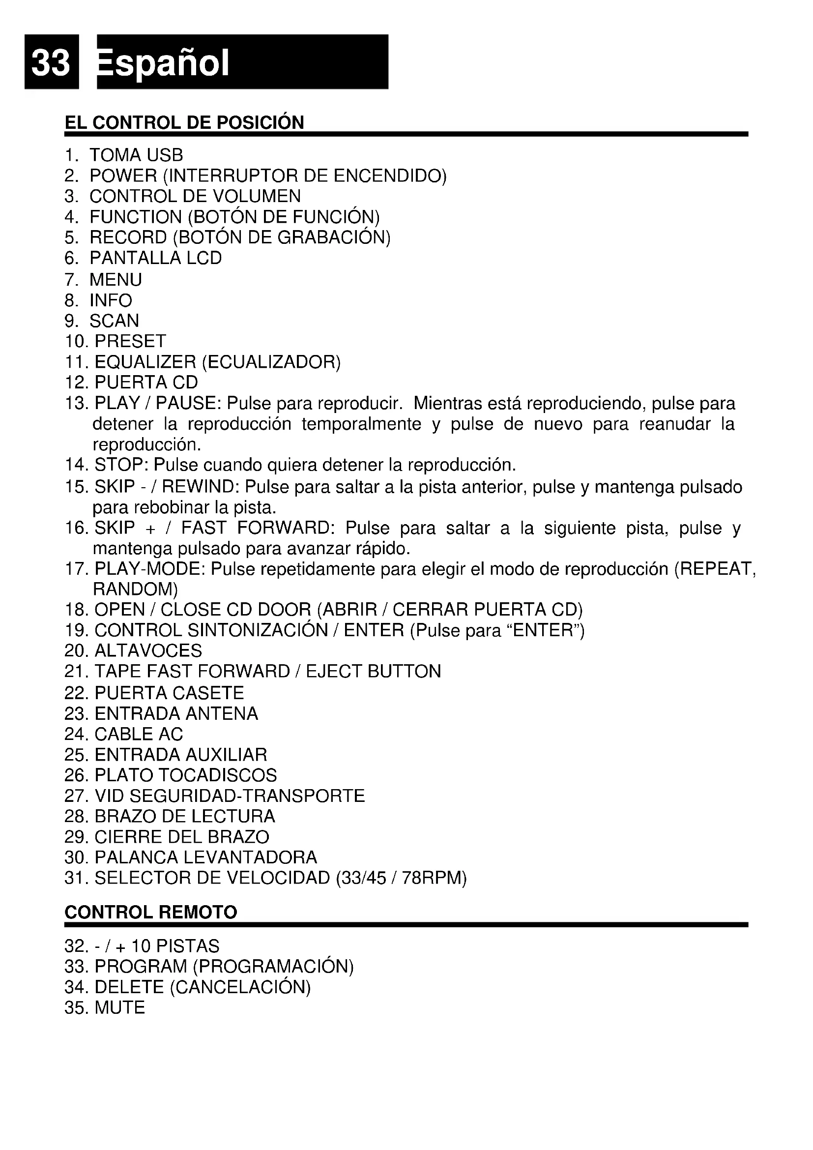 15. SKIP - / REWIND: Pulse para saltar a la pista anterior, pulse y mantenga pulsado