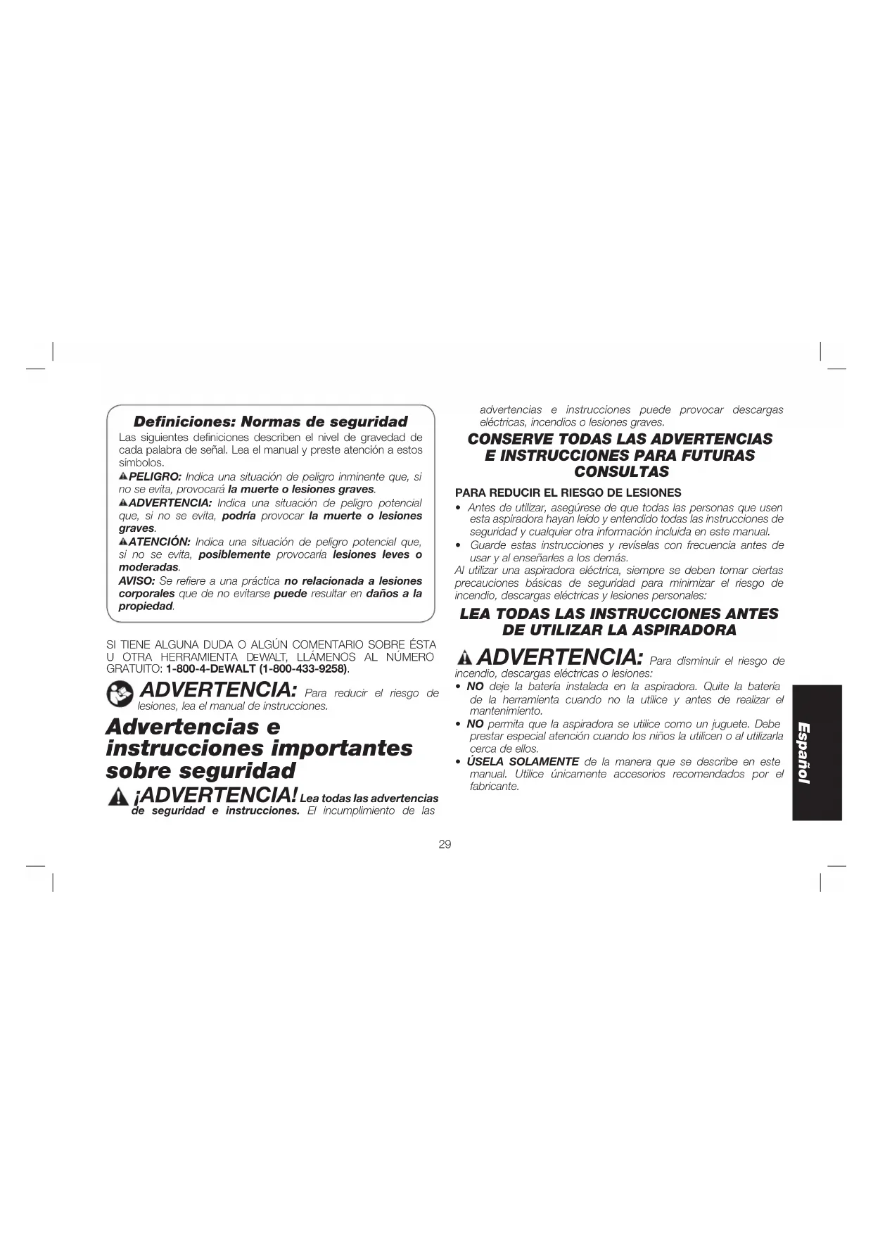 WALT (1-800-433-9258). ADVERTENCIA: Para reducir el riesgo de lesiones, lea el manual de instrucciones. Advertencias e instrucciones importantes sobre seguridad ¡ADVERTENCIA! Lea todas las advertencias de seguridad e instrucciones. El incumplimiento de las advertencias e instrucciones puede provocar descargas eléctricas, incendios o lesiones graves.