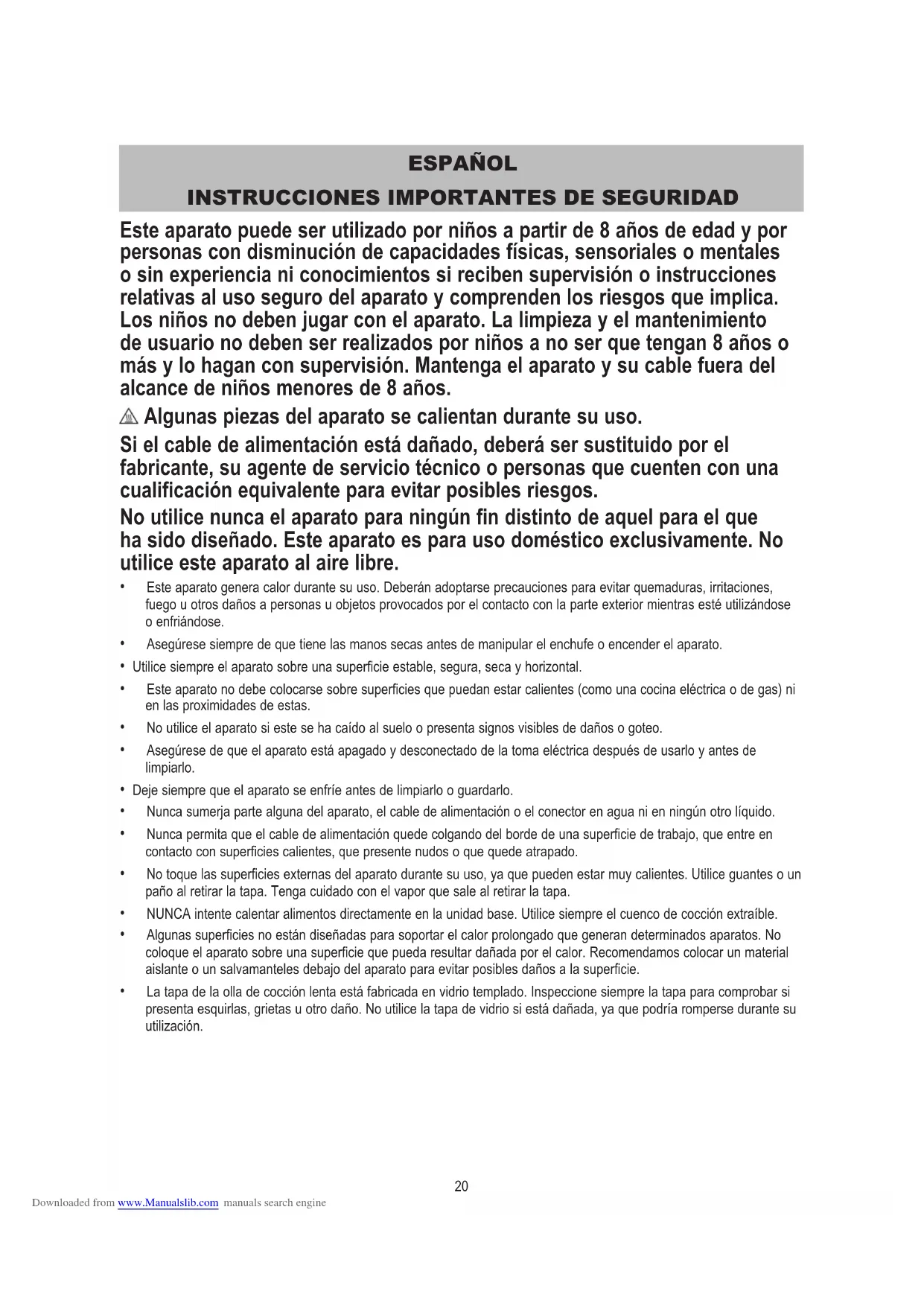 Este aparato puede ser utilizado por niños a partir de 8 años de edad y por personas con disminución de capacidades físicas, sensoriales o mentales o sin experiencia ni conocimientos si reciben supervisión o instrucciones relativas al uso seguro del aparato y comprenden los riesgos que implica. Los niños no deben jugar con el aparato. La limpieza y el mantenimiento de usuario no deben ser realizados por niños a no ser que tengan 8 años o más y lo hagan con supervisión. Mantenga el aparato y su cable fuera del alcance de niños menores de 8 años. Algunas piezas del aparato se calientan durante su uso. Si el cable de alimentación está dañado, deberá ser sustituido por el fabricante, su agente de servicio técnico o personas que cuenten con una cualificación equivalente para evitar posibles riesgos. No utilice nunca el aparato para ningún fin distinto de aquel para el que ha sido diseñado. Este aparato es para uso doméstico exclusivamente. No utilice este aparato al aire libre.