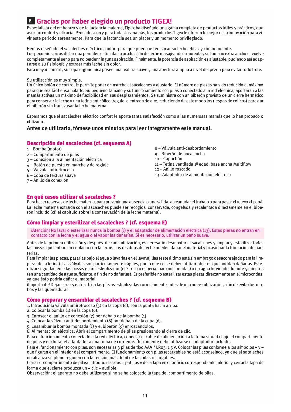Para el funcionamiento conectado a la red eléctrica, conectar el cable de alimentación a la toma situada bajo el compartimento de pilas y enchufar el adaptador a una toma de corriente. Únicamente debe utilizarse el adaptador incluido. Para el funcionamiento con pilas, son necesarias 3 pilas de tipo AAA / LR03, 1,5 V. Colocar las pilas conforme a los símbolos + y – que figuran en el interior del compartimento. El funcionamiento con pilas recargables no está aconsejado, ya que el sacaleches no alcanza su pleno régimen con la tensión más débil de las pilas recargables. Cerrar el compartimento de pilas: introducir las dos « patillas » de la tapa en el orificio correspondiente inferior y cerrar la tapa de forma que el cierre produzca un « clic » audible. Observación: el aparato no debe utilizarse si no se ha colocado la tapa del compartimento de pilas. Descripción del sacaleches (cf. esquema A) 1 – Bomba (motor) 2 – Compartimento de pilas 3 – Conexión a la alimentación eléctrica 4 – Botón de puesta en marcha y de reglaje 5 – Válvula antiretroceso 6 – Copa de textura suave 7 – Anillo de conexión 8 – Válvula anti-desbordamiento 9 – Biberón de boca ancha 10 – Capuchón 11 – Tetina ventilada 1ª edad, base ancha Multiflow 12 – Anillo roscado 13 –Adaptador de alimentación eléctrica Gracias por haber elegido un producto TIGEX! Especialista del embarazo y de la lactancia materna, Tigex ha diseñado una gama completa de productos útiles y prácticos, que asocian confort y eficacia. Pensados con y para todas las mamás, los productos Tigex le ofrecen lo mejor de la innovación para vi- vir este periodo serenamente. Para que la lactancia sea un placer y un momento privilegiado.