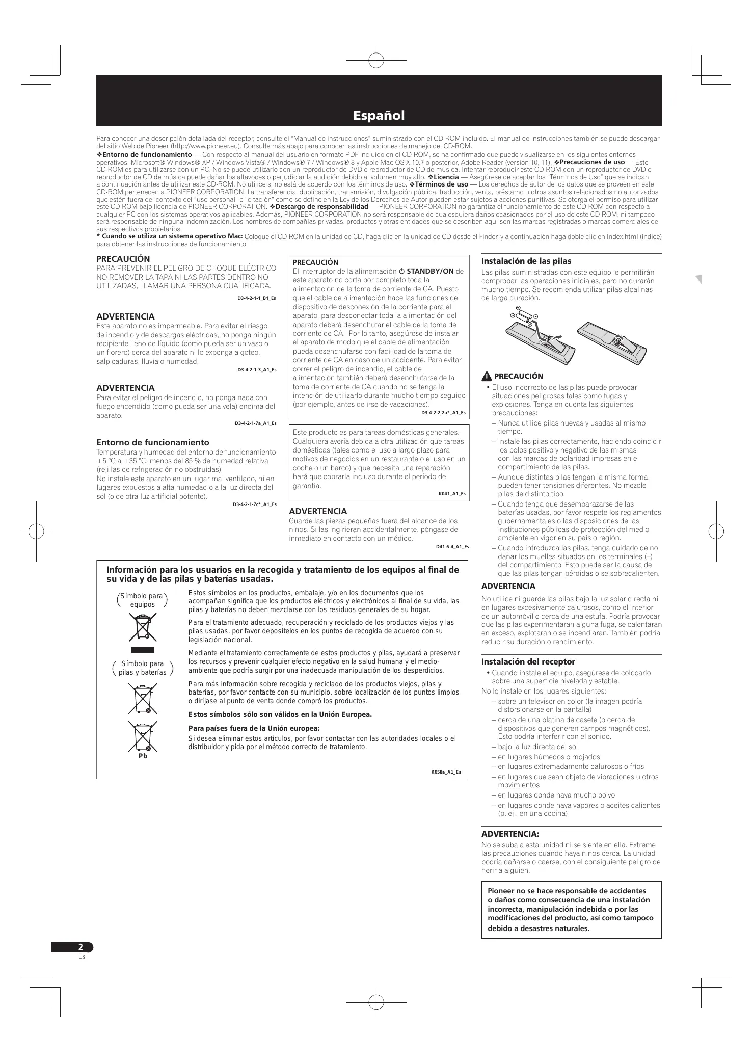 Para conocer una descripción detallada del receptor, consulte el “Manual de instrucciones” suministrado con el CD-ROM incluido. El manual de instrucciones también se puede descargar del sitio Web de Pioneer (http://www.pioneer.eu). Consulte más abajo para conocer las instrucciones de manejo del CD-ROM. Entorno de funcionamiento — Con respecto al manual del usuario en formato PDF incluido en el CD-ROM, se ha confirmado que puede visualizarse en los siguientes entornos operativos: Microsoft® Windows® XP / Windows Vista® / Windows® 7 / Windows® 8 y Apple Mac OS X 10.7 o posterior, Adobe Reader (versión 10, 11). Precauciones de uso — Este CD-ROM es para utilizarse con un PC. No se puede utilizarlo con un reproductor de DVD o reproductor de CD de música. Intentar reproducir este CD-ROM con un reproductor de DVD o reproductor de CD de música puede dañar los altavoces o perjudiciar la audición debido al volumen muy alto. Licencia — Asegúrese de aceptar los “Términos de Uso” que se indican a continuación antes de utilizar este CD-ROM. No utilice si no está de acuerdo con los términos de uso. Términos de uso — Los derechos de autor de los datos que se proveen en este CD-ROM pertenecen a PIONEER CORPORATION. La transferencia, duplicación, transmisión, divulgación pública, traducción, venta, préstamo u otros asuntos relacionados no autorizados que estén fuera del contexto del “uso personal” o “citación” como se define en la Ley de los Derechos de Autor pueden estar sujetos a acciones punitivas. Se otorga el permiso para utilizar este CD-ROM bajo licencia de PIONEER CORPORATION. Descargo de responsabilidad — PIONEER CORPORATION no garantiza el funcionamiento de este CD-ROM con respecto a cualquier PC con los sistemas operativos aplicables. Además, PIONEER CORPORATION no será responsable de cualesquiera daños ocasionados por el uso de este CD-ROM, ni tampoco será responsable de ninguna indemnización. Los nombres de compañías privadas, productos y otras entidades que se describen aquí son las marcas registradas o marcas comerciales de sus respectivos propietarios. * Cuando se utiliza un sistema operativo Mac: Coloque el CD-ROM en la unidad de CD, haga clic en la unidad de CD desde el Finder, y a continuación haga doble clic en Index.html (índice) para obtener las instrucciones de funcionamiento.