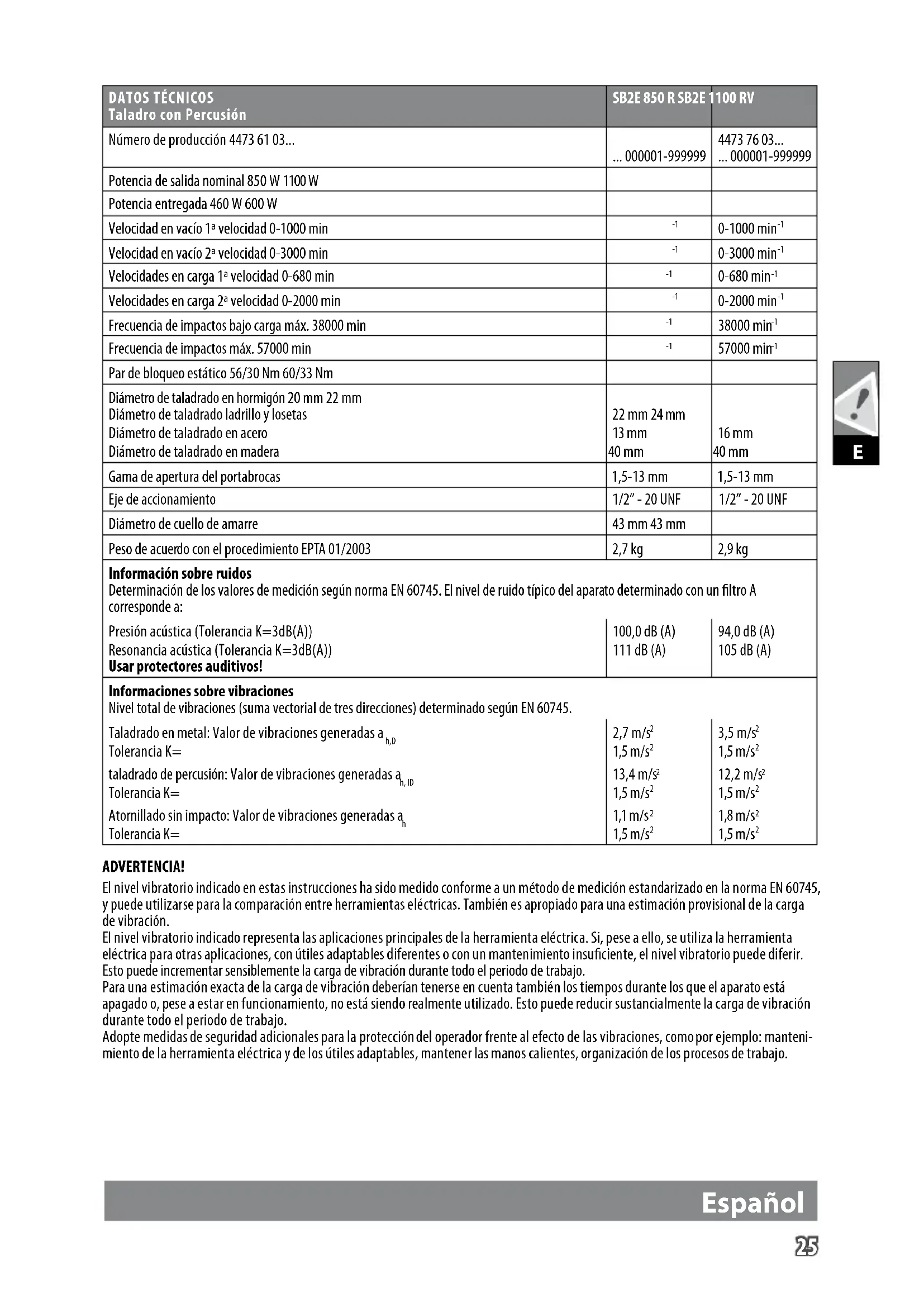 Taladro con Percusión SB2E 850 R SB2E 1100 RV Número de producción 4473 61 03... ... 000001-999999