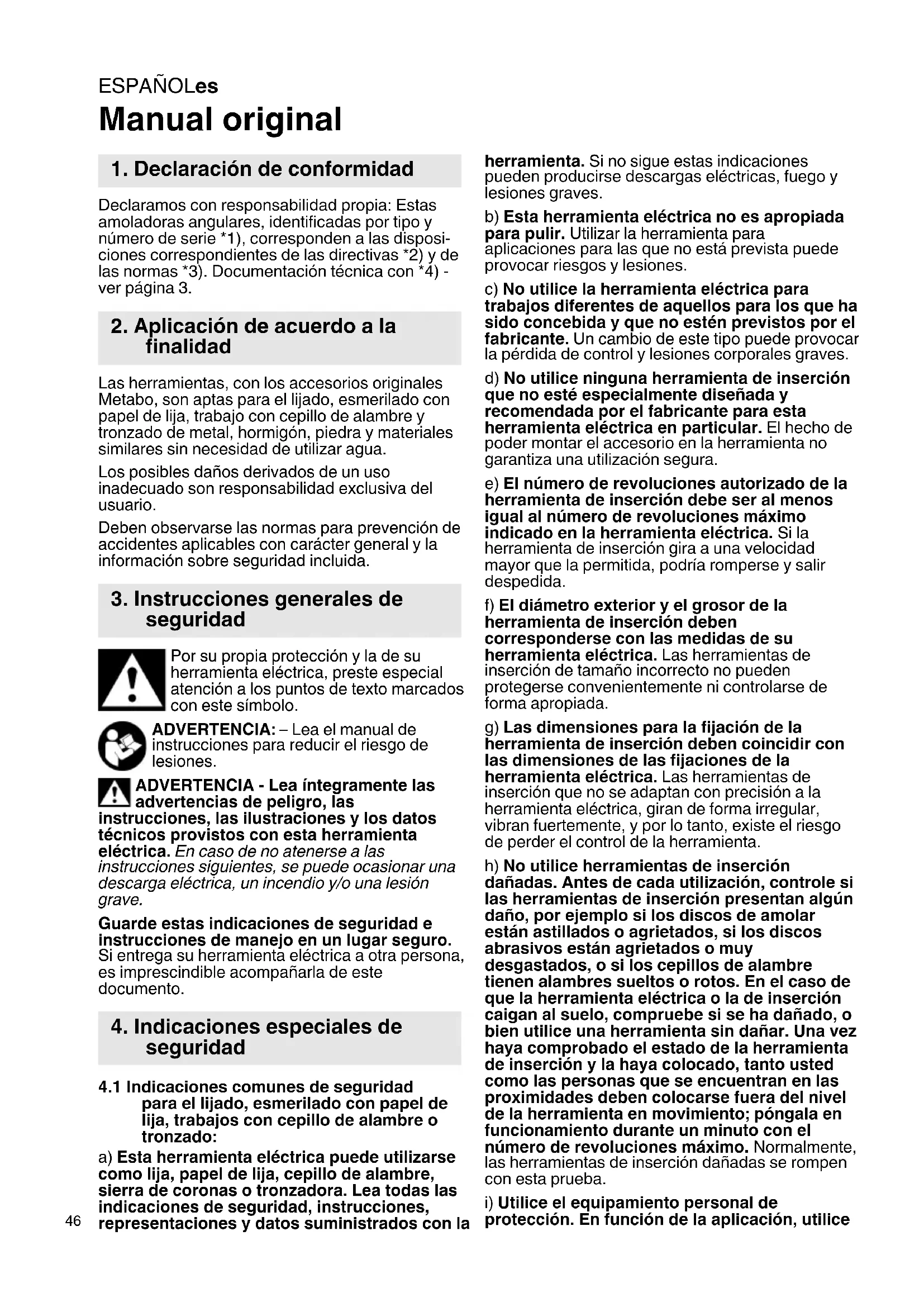 Manual original Declaramos con responsabilidad propia: Estas amoladoras angulares, identificadas por tipo y número de serie *1), corresponden a las disposi- ciones correspondientes de las directivas *2) y de las normas *3). Documentación técnica con *4) - ver página 3. Las herramientas, con los accesorios originales Metabo, son aptas para el lijado, esmerilado con papel de lija, trabajo con cepillo de alambre y tronzado de metal, hormigón, piedra y materiales similares sin necesidad de utilizar agua. Los posibles daños derivados de un uso inadecuado son responsabilidad exclusiva del usuario. Deben observarse las normas para prevención de accidentes aplicables con carácter general y la información sobre seguridad incluida. Por su propia protección y la de su herramienta eléctrica, preste especial atención a los puntos de texto marcados con este símbolo. ADVERTENCIA: – Lea el manual de instrucciones para reducir el riesgo de lesiones. ADVERTENCIA - Lea íntegramente las advertencias de peligro, las instrucciones, las ilustraciones y los datos técnicos provistos con esta herramienta eléctrica. En caso de no atenerse a las instrucciones siguientes, se puede ocasionar una descarga eléctrica, un incendio y/o una lesión grave. Guarde estas indicaciones de seguridad e instrucciones de manejo en un lugar seguro. Si entrega su herramienta eléctrica a otra persona, es imprescindible acompañarla de este documento.