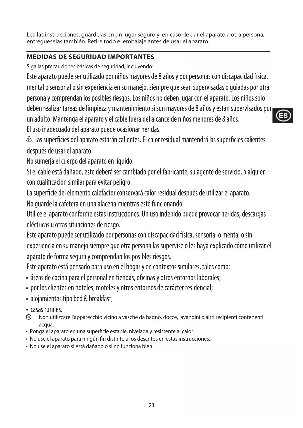 Siga las precauciones básicas de seguridad, incluyendo: Este aparato puede ser utilizado por niños mayores de 8 años y por personas con discapacidad física, mental o sensorial o sin experiencia en su manejo, siempre que sean supervisadas o guiadas por otra persona y comprendan los posibles riesgos. Los niños no deben jugar con el aparato. Los niños solo deben realizar tareas de limpieza y mantenimiento si son mayores de 8 años y están supervisados por un adulto. Mantenga el aparato y el cable fuera del alcance de niños menores de 8 años. El uso inadecuado del aparato puede ocasionar heridas. h Las supercies del aparato estarán calientes. El calor residual mantendrá las supercies calientes después de usar el aparato. No sumerja el cuerpo del aparato en líquido. Si el cable está dañado, este deberá ser cambiado por el fabricante, su agente de servicio, o alguien con cualicación similar para evitar peligro. La supercie del elemento calefactor conservará calor residual después de utilizar el aparato. No guarde la cafetera en una alacena mientras esté funcionando. Utilice el aparato conforme estas instrucciones. Un uso indebido puede provocar heridas, descargas eléctricas u otras situaciones de riesgo. Este aparato puede ser utilizado por personas con discapacidad física, sensorial o mental o sin experiencia en su manejo siempre que otra persona las supervise o les haya explicado cómo utilizar el aparato de forma segura y comprendan los posibles riesgos. Este aparato está pensado para uso en el hogar y en contextos similares, tales como: