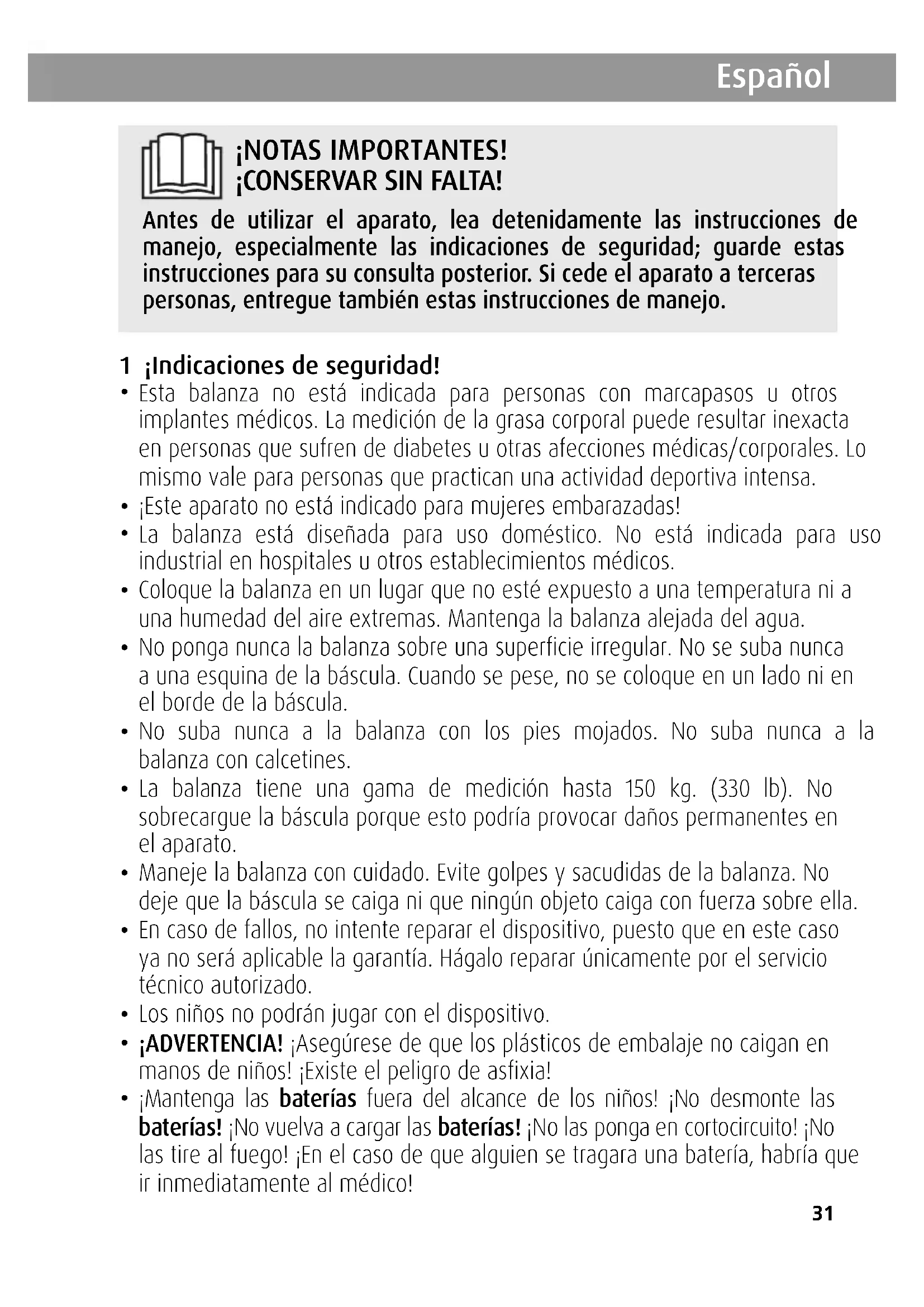 - Esta balanza no está indicada para personas con marcapasos u otros implantes médicos. La medición de la grasa corporal puede resultar inexacta en personas que sufren de diabetes u otras afecciones médicas/corporales. Lo mismo vale para personas que practican una actividad deportiva intensa.