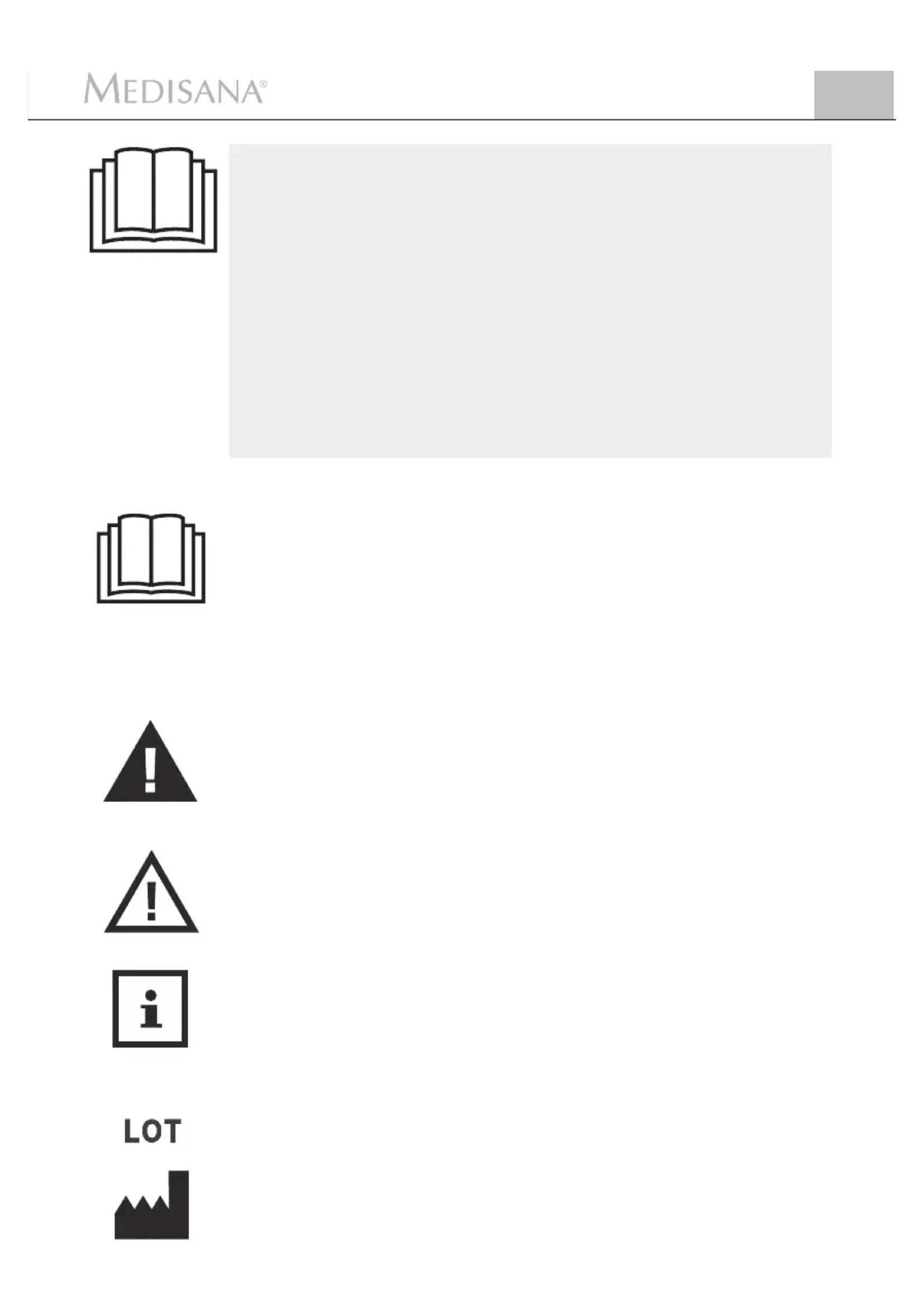 Datos técnicos En www.medisana.com encontrará la versión más actual de estas instrucciones de uso. 3 Aplicación / 4 Generalidades
