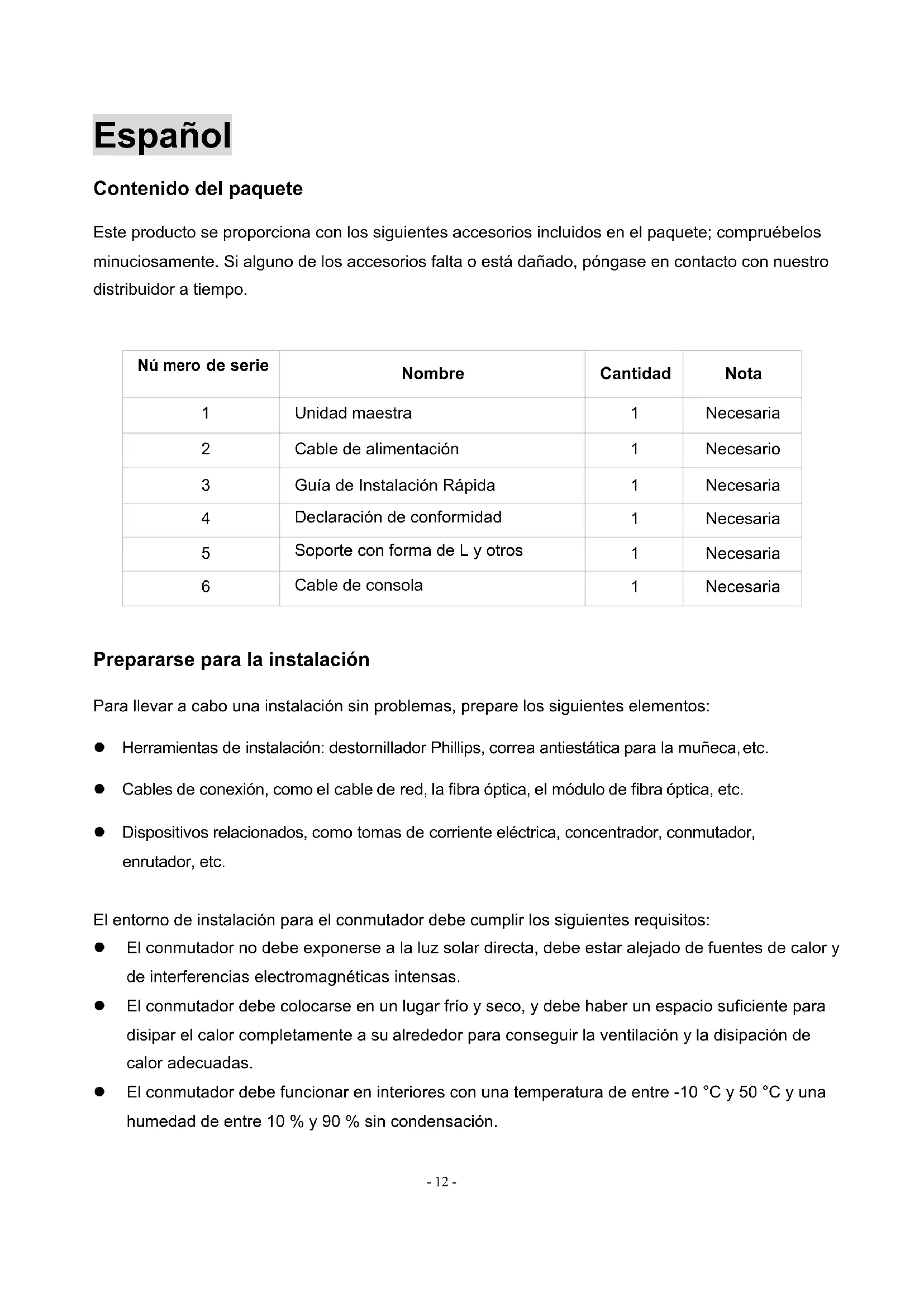Español Contenido del paquete Este producto se proporciona con los siguientes accesorios incluidos en el paquete; compruébelos minuciosamente. Si alguno de los accesorios falta o está dañado, póngase en contacto con nuestro distribuidor a tiempo. Nú mero de serie Nombre Cantidad Nota