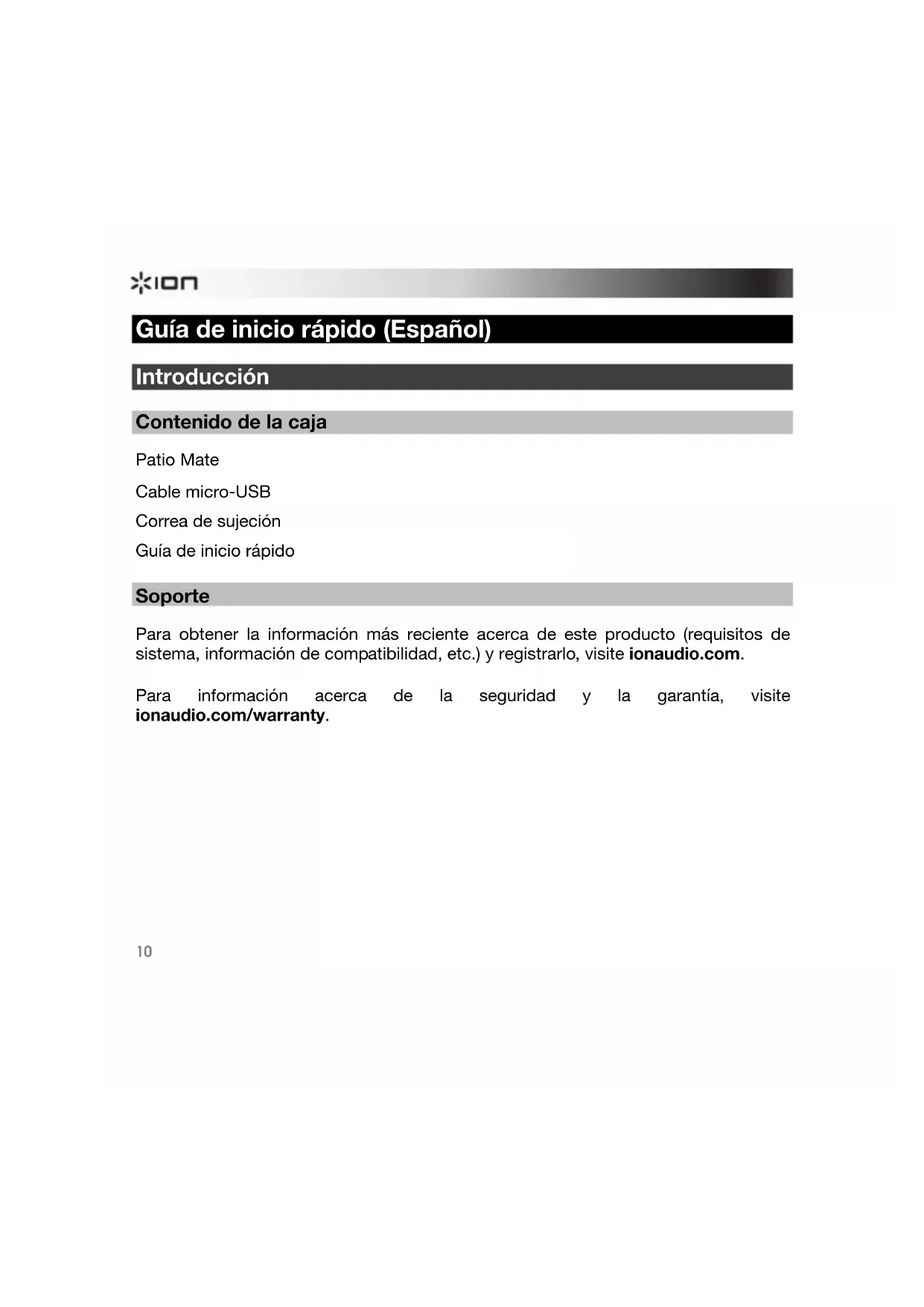 Guía de inicio rápido (Español) Introducción Contenido de la caja Patio Mate Cable micro-USB Correa de sujeción Guía de inicio rápido Soporte Para obtener la información más reciente acerca de este producto (requisitos de sistema, información de compatibilidad, etc.) y registrarlo, visite ionaudio.com. Para información acerca de la seguridad y la garantía, visite ionaudio.com/warranty.11