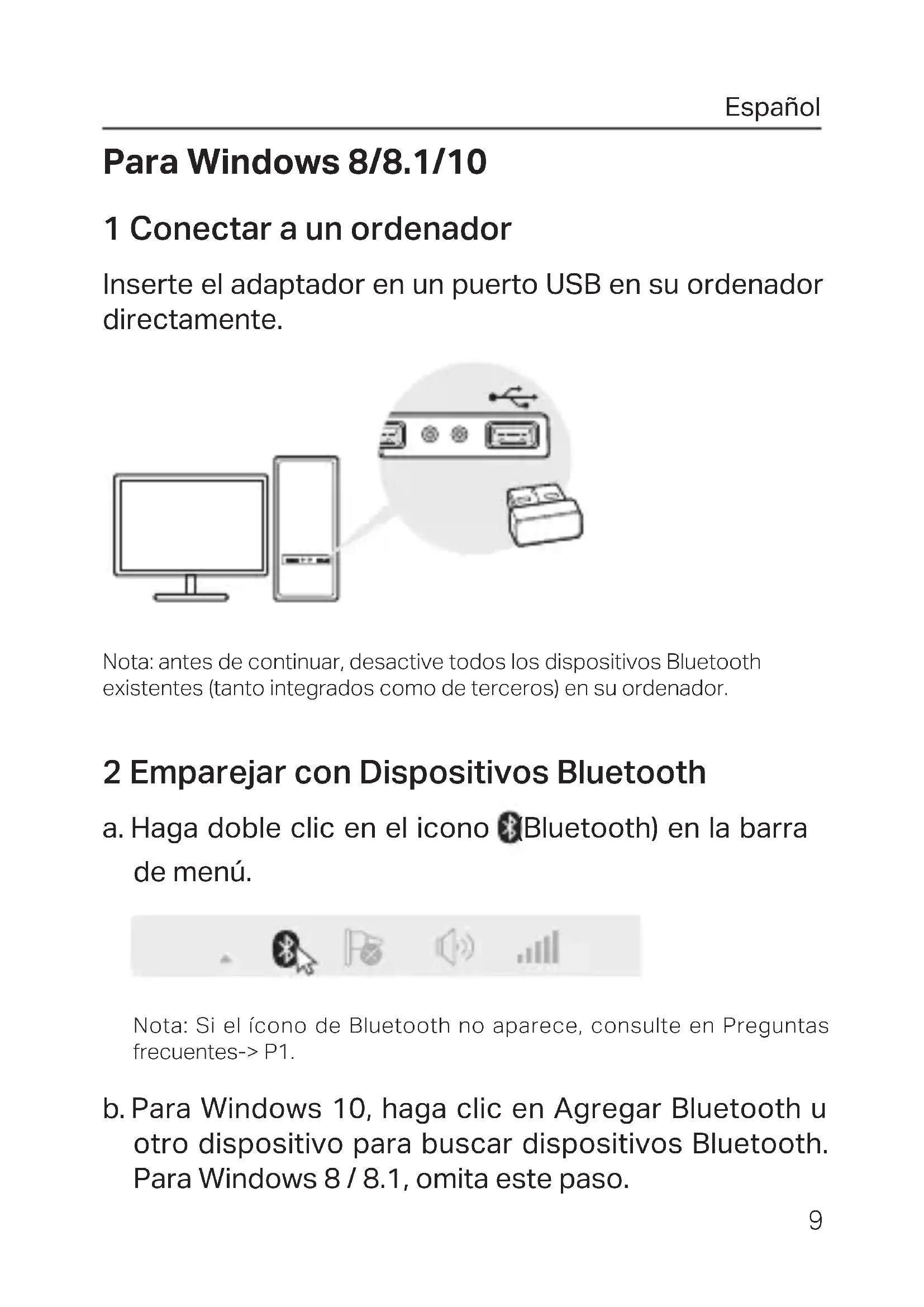 Para Windows 8/8.1/10 1 Conectar a un ordenador Inserte el adaptador en un puerto USB en su ordenador directamente. Nota: antes de continuar, desactive todos los dispositivos Bluetooth existentes (tanto integrados como de terceros) en su ordenador. 2 Emparejar con Dispositivos Bluetooth a. Haga doble clic en el icono (Bluetooth) en la barra de menú. Nota: Si el ícono de Bluetooth no aparece, consulte en Preguntas frecuentes-> P1. b. Para Windows 10, haga clic en Agregar Bluetooth u otro dispositivo para buscar dispositivos Bluetooth. Para Windows 8 / 8.1, omita este paso.Español