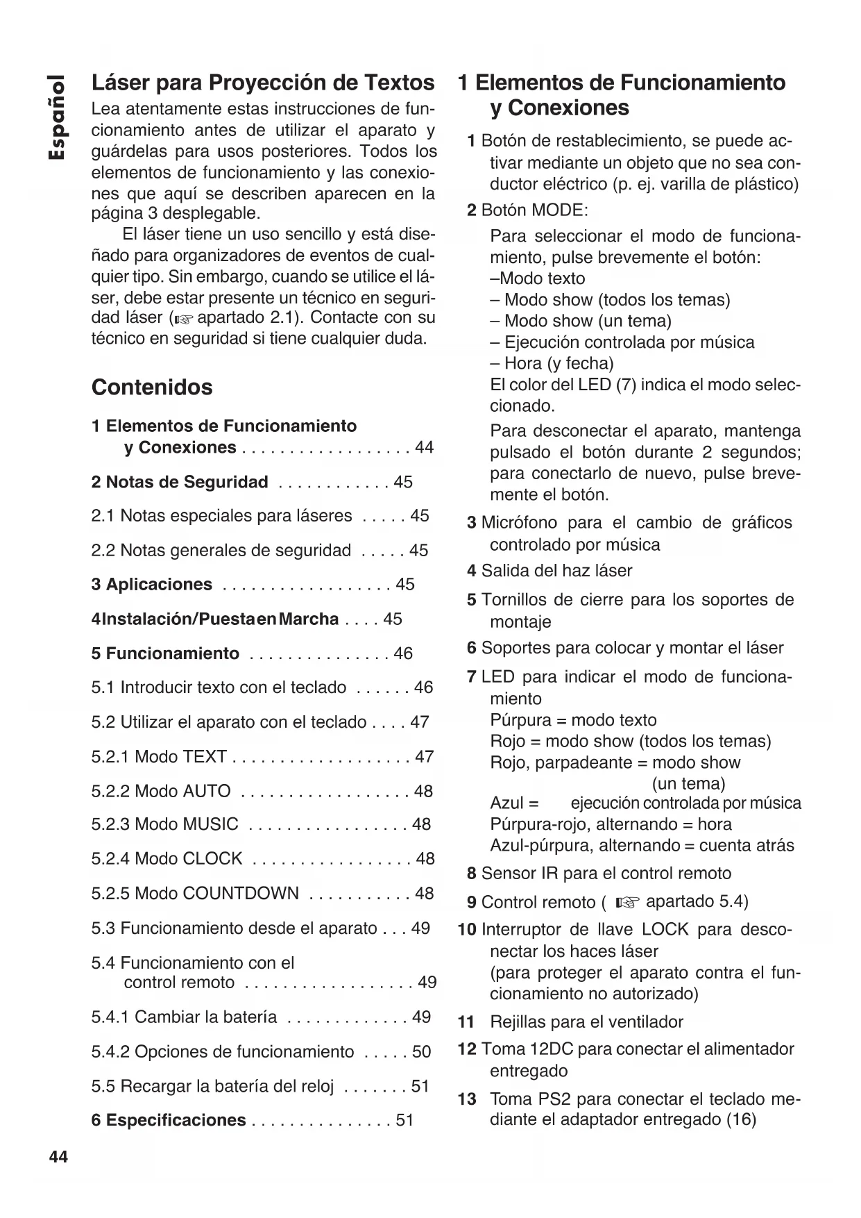 El láser tiene un uso stencil y está Diseñado para organizadores de eventos de cualquier tipo. Sin embargo, cuando se usa el láser,Debe estar presente un technician en seguidad láser (apartado 2.1). Contacte con su technician en seguidad siieneequalquier duda.