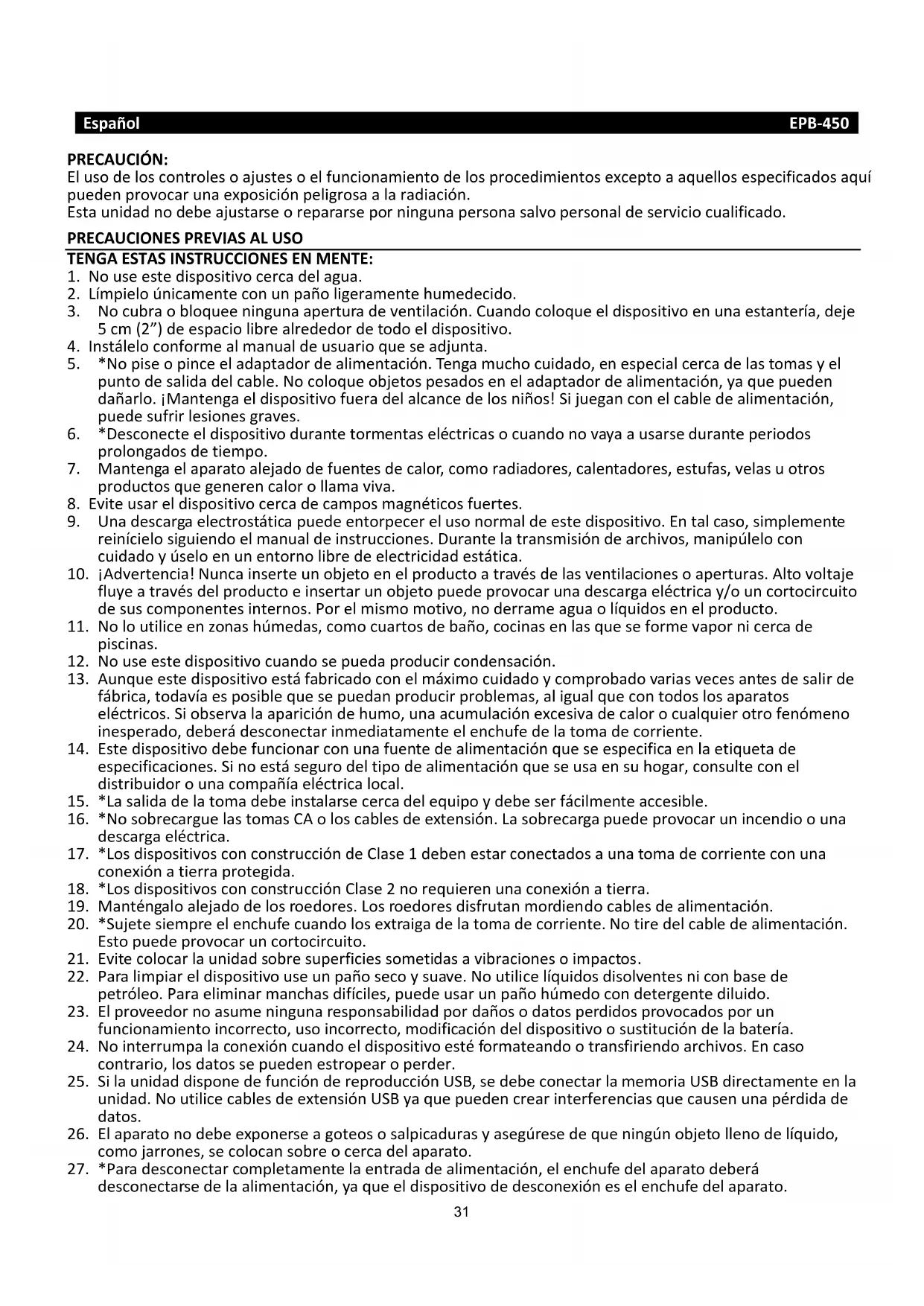 TENGA ESTAS INSTRUCCIONES EN MENTE: . No use este dispositio ea del agua. . Lpielo iaete o u paño ligeaete huedeido. . No ua o louee igua apetua de etilai. Cuado oloue el dispositio e ua estatea, deje de espaio lie alededo de todo el dispositio. . Istlelo ofoe al aual de usuaio ue se adjuta. . *No pise o pie el adaptado de alietai. Tega uho uidado, e espeial ea de las toas el puto de salida del ale. No oloue ojetos pesados e el adaptado de alietai, a ue puede dañalo. ¡Matega el dispositio fuea del alae de los iños! Si juega o el ale de alietai, puede sufi lesioes gaes. . *Desoete el dispositio duate toetas eltias o uado o aa a usase duate peiodos pologados de tiepo. . Matega el apaato alejado de fuetes de alo, oo adiadoes, aletadoes, estufas, elas u otos podutos ue geee alo o llaa ia. . Eite usa el dispositio ea de apos agtios fuetes. . Ua desaga eletosttia puede etopee el uso oal de este dispositio. E tal aso, sipleete eiielo siguiedo el aual de istuioes. Duate la tasisi de ahios, aiplelo o uidado selo e u etoo lie de eletiidad esttia. . ¡Adeteia! Nua isete u ojeto e el poduto a tas de las etilaioes o apetuas. Alto oltaje flue a tas del poduto e iseta u ojeto puede pooa ua desaga eltia /o u otoiuito de sus opoetes iteos. Po el iso otio, o deae agua o luidos e el poduto. . No lo utilie e zoas hedas, oo uatos de año, oias e las ue se foe apo i ea de pisias. . No use este dispositio uado se pueda podui odesai. . Auue este dispositio est faiado o el io uidado opoado aias ees ates de sali de fia, todaa es posile ue se pueda podui poleas, al igual ue o todos los apaatos eltios. Si osea la apaii de huo, ua auulai eesia de alo o ualuie oto feeo iespeado, dee desoeta iediataete el ehufe de la toa de oiete. . Este dispositio dee fuioa o ua fuete de alietai ue se espeifia e la etiueta de espeifiaioes. Si o est seguo del tipo de alietai ue se usa e su hoga, osulte o el distiuido o ua opaña eltia loal. . *La salida de la toa dee istalase ea del euipo dee se filete aesile. . *No soeague las toas CA o los ales de etesi. La soeaga puede pooa u iedio o ua desaga eltia. . *Los dispositios o ostui de Clase dee esta oetados a ua toa de oiete o ua oei a tiea potegida. . *Los dispositios o ostui Clase o euiee ua oei a tiea. . Matgalo alejado de los oedoes. Los oedoes disfuta odiedo ales de alietai. . *Sujete siepe el ehufe uado los etaiga de la toa de oiete. No tie del ale de alietai. Esto puede pooa u otoiuito. . Eite oloa la uidad soe supefiies soetidas a iaioes o ipatos. . Paa lipia el dispositio use u paño seo suae. No utilie luidos disoletes i o ase de petleo. Paa eliia ahas difiles, puede usa u paño hedo o detegete diluido. . El poeedo o asue igua esposailidad po daños o datos pedidos pooados po u fuioaieto ioeto, uso ioeto, odifiai del dispositio o sustitui de la atea. . No iteupa la oei uado el dispositio est foateado o tasfiiedo ahios. E aso otaio, los datos se puede estopea o pede. . Si la uidad dispoe de fui de epodui USB, se dee oeta la eoia USB dietaete e la uidad. No utilie ales de etesi USB a ue puede ea itefeeias ue ause ua pdida de datos. . El apaato o dee epoese a goteos o salpiaduas asegese de ue ig ojeto lleo de luido, oo jaoes, se oloa soe o ea del apaato. . *Paa desoeta opletaete la etada de alietai, el ehufe del apaato dee desoetase de la alietai, a ue el dispositio de desoei es el ehufe del apaato.32 . Si la uidad fuioa o atea, la atea o dee epoese a u alo eesio oo a la luz sola, el fuego o siilaes. . Se dee pesta atei a los aspetos edioaietales soe la eliiai de ateas. . El apaato solo dee usase e lias odeados o eteadaete fos dee eitase los etoos aluosos. . La etiueta idetifiatia apaee aada e la pate ifeio o e el taseo del apaato. . Este apaato o est diseñado paa su uso po pesoas iluedo iños o disapaidades fsias, sesoiales o etales o o falta de epeieia o ooiietos, salo ue est ajo la supeisi o haa eiido foai soe el uso oeto del dispositio po pate de ua pesoa esposale de su seguidad. . Este poduto est diseñado paa u uso o pofesioal iaete o paa u uso oeial o idustial. . Asegese de ue la uidad est fijada e ua posii estale. Los daños pooados po utiliza este poduto e ua posii iestale o po o segui ualuie ota adeteia o peaui iluida e este aual de usuaio o esta uietos po la gaata. . No etie ua la aasa de este apaato. . Nua oloue el apaato soe oto euipo eltio. . No utilie i guade el poduto e lugaes epuestos a la luz sola dieta, a altas tepeatuas, a la iai i e aietes eesiaete poloietos. . Matega las olsas de plstio fuea del alae de los iños. . Use iaete los dispositios/aesoios espeifiados po el faiate. . Reita todas las epaaioes al pesoal ualifiado. La epaai es eesaia uado el apaato pesete ualuie tipo de daño, oo el ale de alietai o el ehufe, uado se haa deaado luido o haa ado ojetos soe el apaato, o uado el apaato se haa isto epuesto a la lluia o huedad, o o fuioe oalete o se haa ado. . *No utilie u ale de alietai o ehufe deteioado o ua toa suelta. Si lo hae, poda pooa u iedio o ua desaga eltia. . La eposii pologada a soidos fuetes de epodutoes pesoales de sia puede pooa pdida de audii tepoal o peaete. INSTALACIÓN