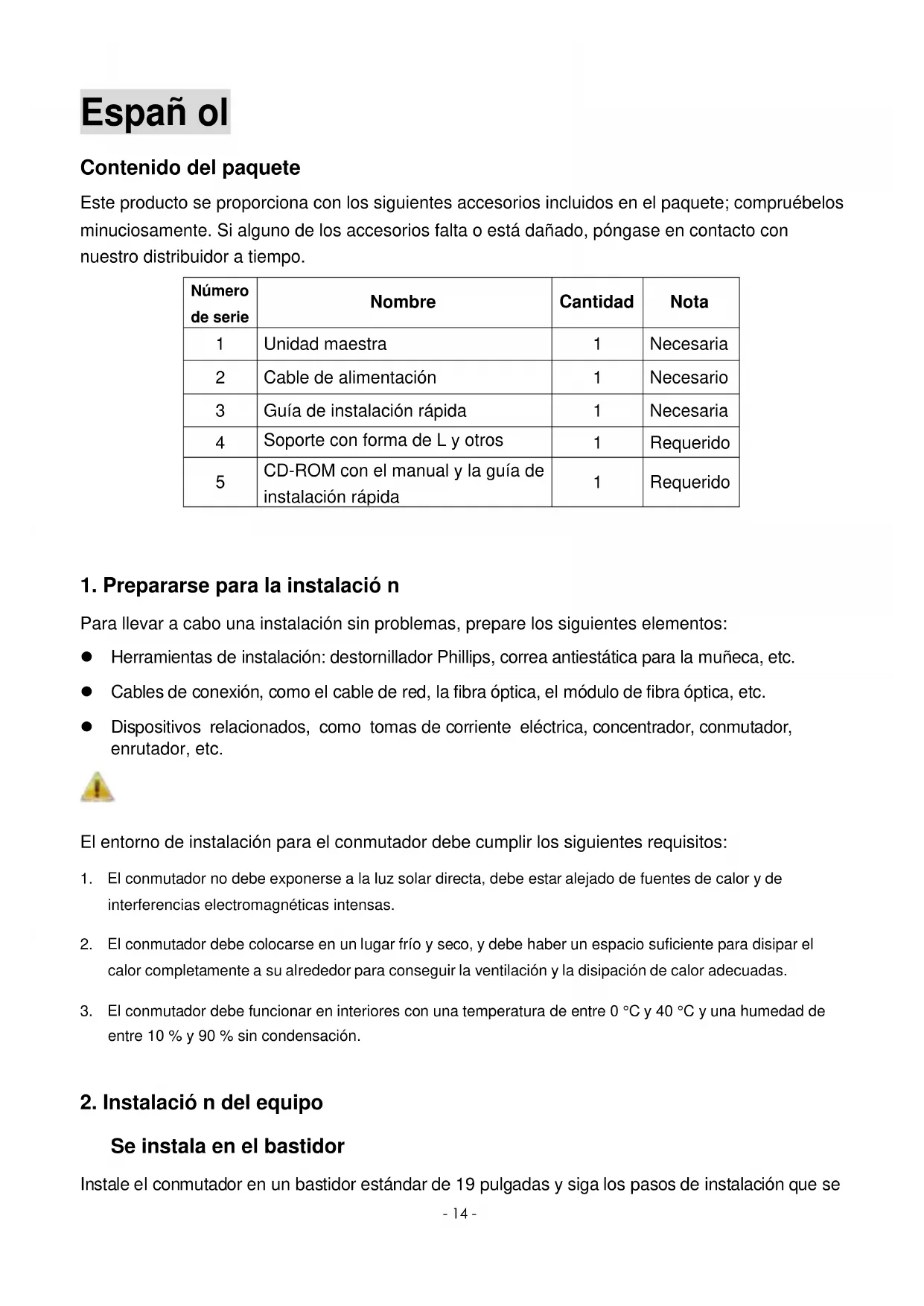 Para llevar a cabo una instalación sin problemas, prepare los siguientes elementos: Herramientas de instalación: destornillador Phillips, correa antiestática para la muñeca, etc. Cables de conexión, como el cable de red, la fibra óptica, el módulo de fibra óptica, etc. Dispositivos relacionados, como tomas de corriente eléctrica, concentrador, conmutador, enrutador, etc. El entorno de instalación para el conmutador debe cumplir los siguientes requisitos: