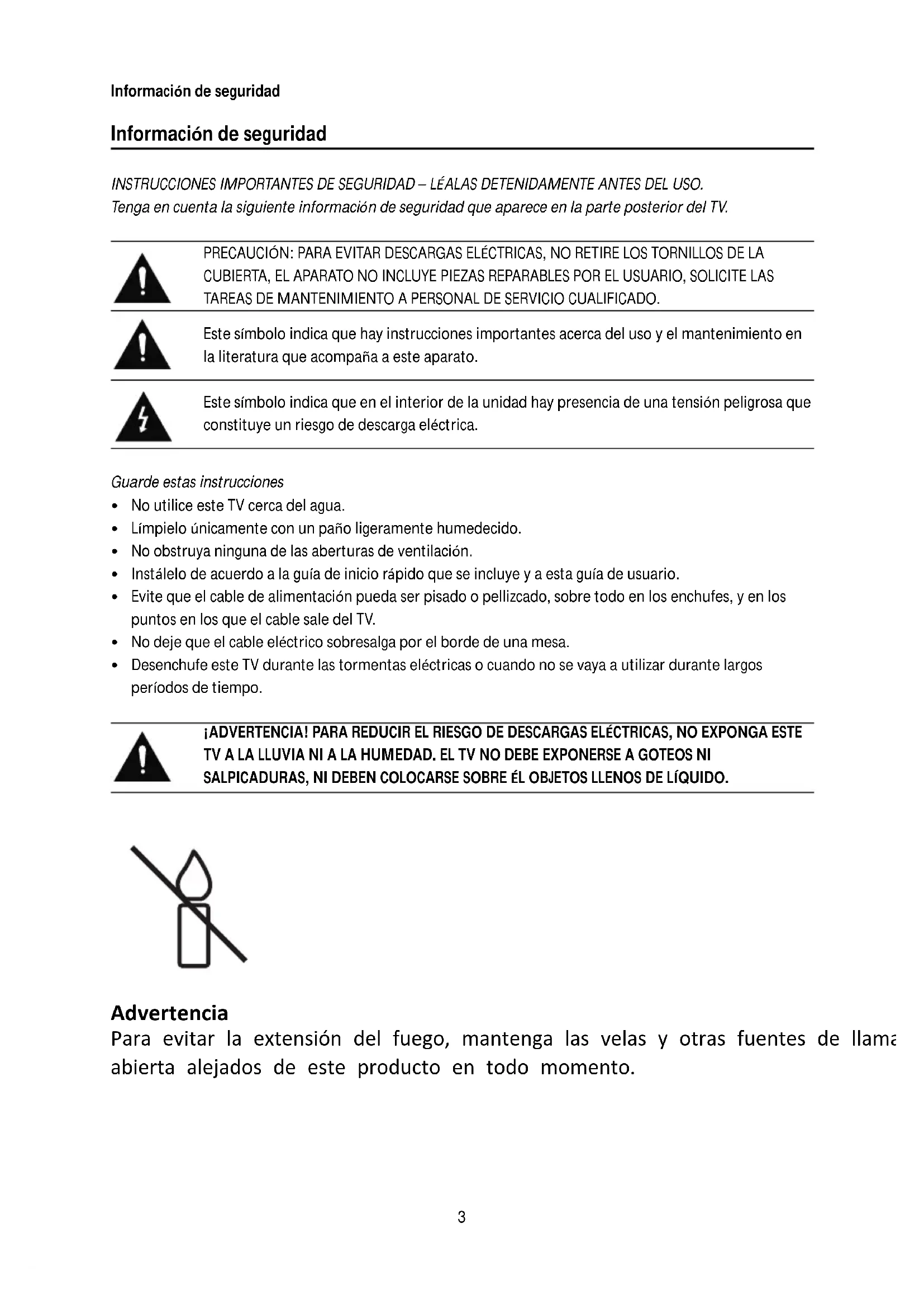 TVALALLUVIANIALAHUMEDAD.ELTVNODEBEEXPONERSEAGOTEOSNI SALPICADURAS,NIDEBENCOLOCARSESOBRE ÉLOBJETOSLLENOSDELÍQUIDO. Advertencia Para evitar la extensión del fuego, mantenga las velas y otras fuentes de llama abierta alejados de este producto en todo momento.Informacióndeseguridad