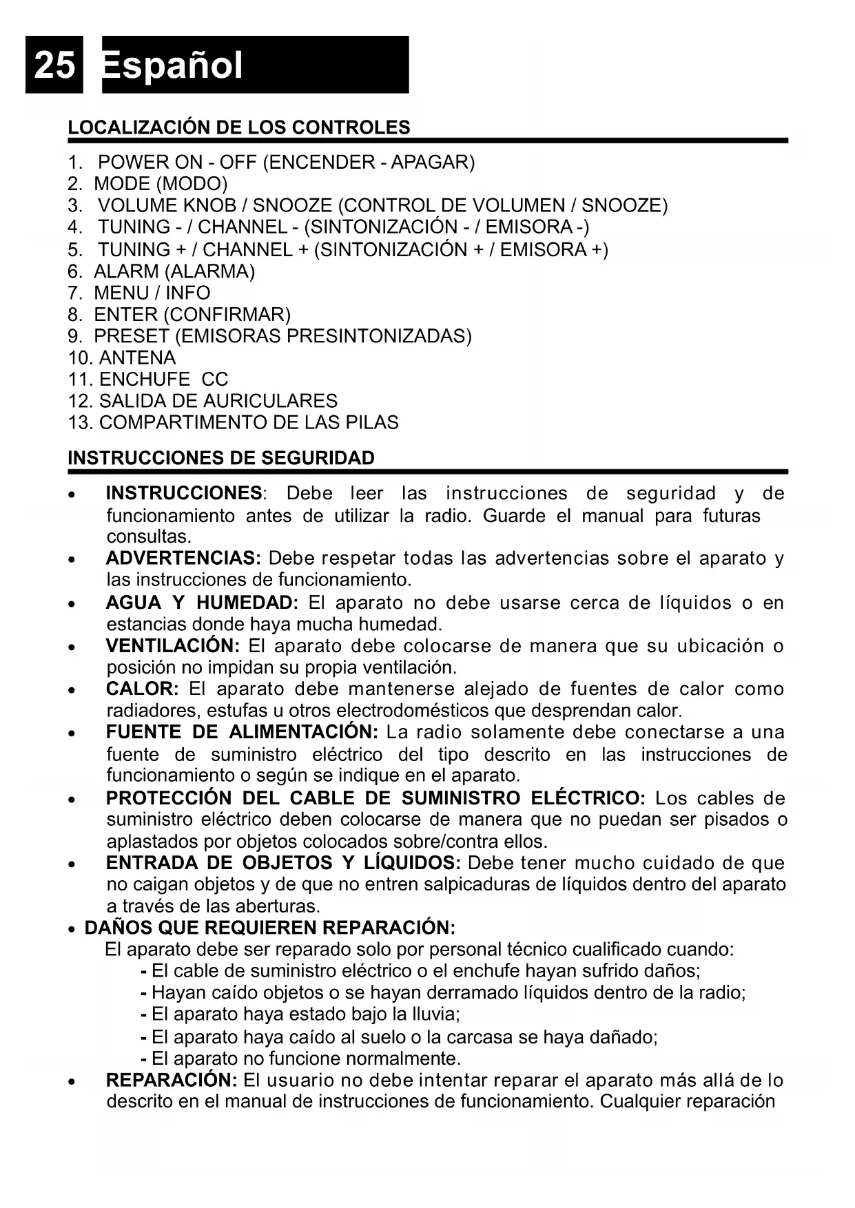 INSTRUCCIONES: Debe leer las instrucciones de seguridad y de funcionamiento antes de utilizar la radio. Guarde el manual para futuras consultas. ADVERTENCIAS: Debe respetar todas las advertencias sobre el aparato y las instrucciones de funcionamiento. AGUA Y HUMEDAD: El aparato no debe usarse cerca de líquidos o en estancias donde haya mucha humedad. VENTILACIÓN: El aparato debe colocarse de manera que su ubicación o posición no impidan su propia ventilación. CALOR: El aparato debe mantenerse alejado de fuentes de calor como radiadores, estufas u otros electrodomésticos que desprendan calor. FUENTE DE ALIMENTACIÓN: La radio solamente debe conectarse a una fuente de suministro eléctrico del tipo descrito en las instrucciones de funcionamiento o según se indique en el aparato. PROTECCIÓN DEL CABLE DE SUMINISTRO ELÉCTRICO: Los cables de suministro eléctrico deben colocarse de manera que no puedan ser pisados o aplastados por objetos colocados sobre/contra ellos. ENTRADA DE OBJETOS Y LÍQUIDOS: Debe tener mucho cuidado de que no caigan objetos y de que no entren salpicaduras de líquidos dentro del aparato a través de las aberturas. DAÑOS QUE REQUIEREN REPARACIÓN: El aparato debe ser reparado solo por personal técnico cualificado cuando: - El cable de suministro eléctrico o el enchufe hayan sufrido daños; - Hayan caído objetos o se hayan derramado líquidos dentro de la radio; - El aparato haya estado bajo la lluvia; - El aparato haya caído al suelo o la carcasa se haya dañado; - El aparato no funcione normalmente. REPARACIÓN: El usuario no debe intentar reparar el aparato más allá de lo descrito en el manual de instrucciones de funcionamiento. Cualquier reparación26 Español debe ser realizada por personal técnico cualificado. Nota: Si la pantalla no se muestra correctamente o los controles no funcionan, esto podría deberse a una descarga electrostática. Apague, desenchufe el cable de corriente alterna (CA) y saque todas las pilas; a continuación, vuelva a encender el aparato después de unos segundos.
