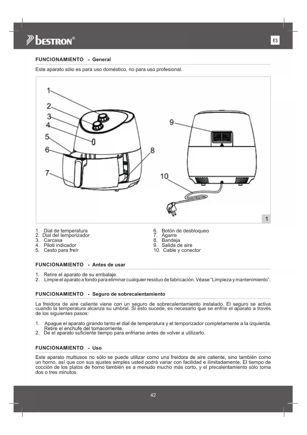 ción Bestron. Sin embargo, no nos envíe ninguna pieza sin preguntar antes. Puede que rechacemos el paquete y esto podría suponer unos gastos para usted. Póngase primero en contacto con nosotros para que le expliquemos cómo tiene que embalar el aparato y mandárnoslo. Cualquier reclamación sobre la garantía debe ir acompañada de una prueba de compra.45