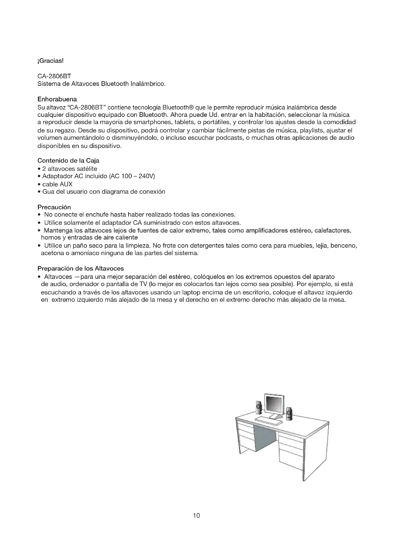 Su altavoz "CA-2806BT" contiene tecnología Bluetooth® que le permite reproducir música inalámbrica desde cualquier dispositivo equipado con Bluetooth. Ahora puede Ud. entrar en la habitación, seleccionar la música a reproducir desde la mayoría de smartphones, tablets, o portátiles, y controlar los ajustes desde la comodidad de su regazo. Desde su dispositivo, podrá controlar y cambiar fácilmente pistas de música, playlists, ajustar el volumen aumentándolo o disminuyéndolo, o incluso escuchar podcasts, o muchas otras aplicaciones de audio disponibles en su dispositivo.