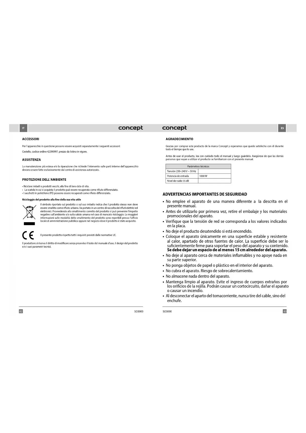 AGRADECIMIENTO Gracias por comprar este producto de la marca Concept y esperamos que quede satisfecho con él durante todo el tiempo que lo use. Antes de usar el producto, lea con cuidado todo el manual y luego guárdelo. Asegúrese de que las demás personas que vayan a utilizar el producto se familiaricen con el presente manual. Parámetros técnicos Tensión 230–240 V ~ 50 Hz Potencia de entrada 1000 W Nivel de ruido 55 dB ADVERTENCIAS IMPORTANTES DE SEGURIDAD: