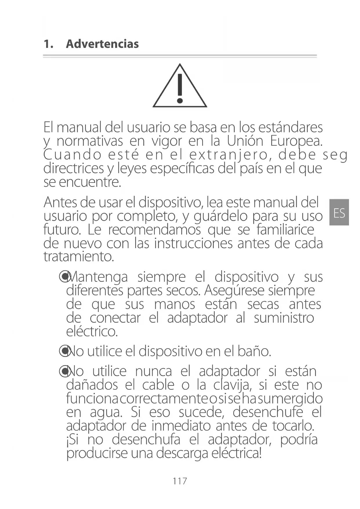 Mantenga siempre el dispositivo y sus differentes partes secs. Asegúrese siempre de que sus manos están secas antes de conectar el adaptorador al suministro electrico.