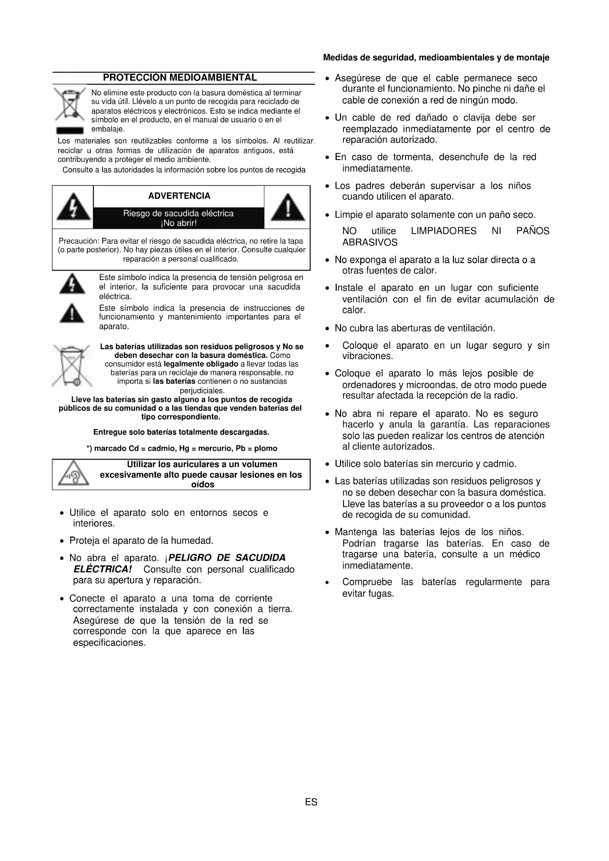 Precaución: Para evitar el riesgo de sacudida eléctrica, no retire la tapa (o parte posterior). No hay piezas útiles en el interior. Consulte cualquier reparación a personal cualificado.