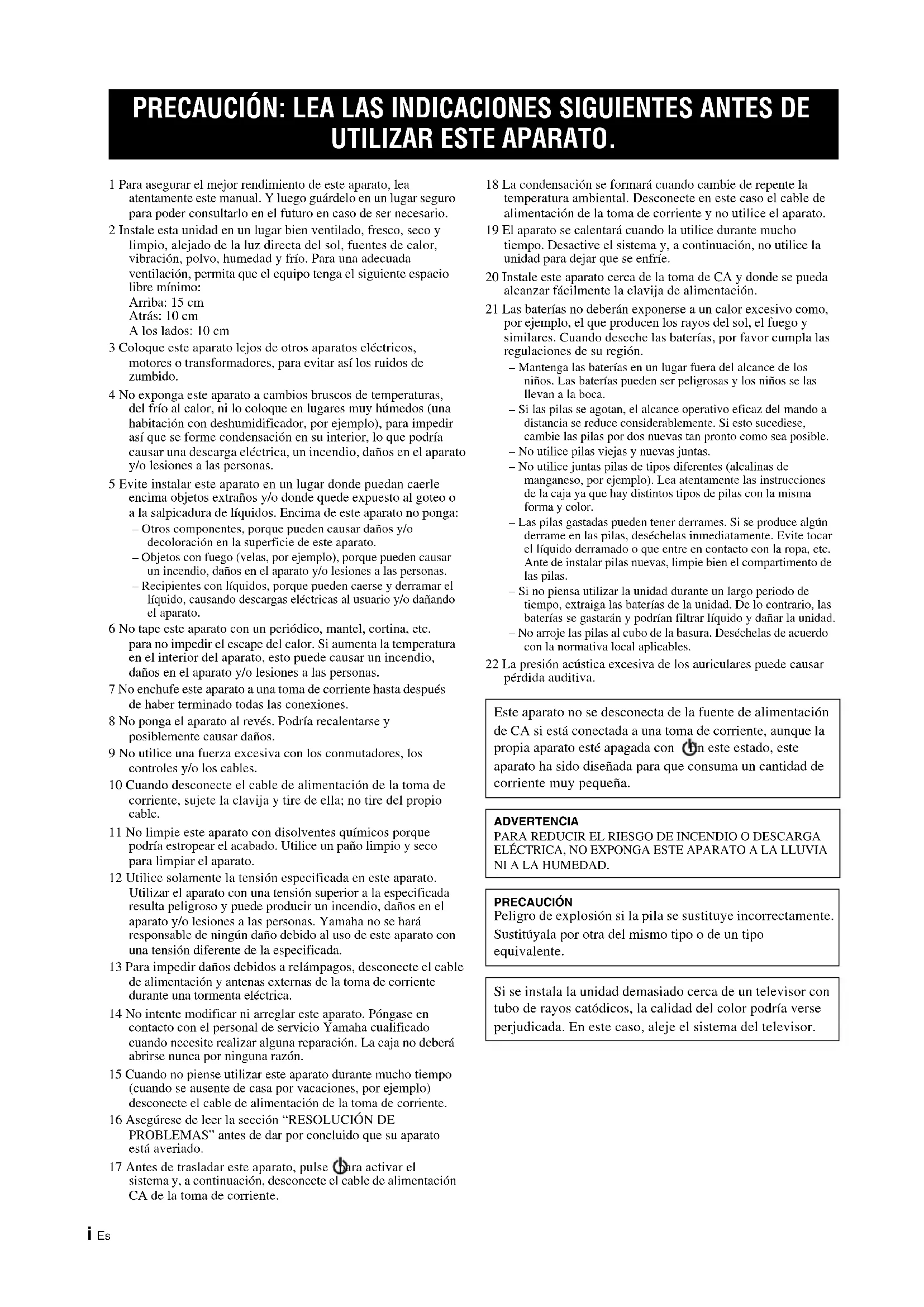 - La banda di 2,4 GHz utilizzata dai dispositivi compatibili Bluetooth è una banda radio condivisa da molti tipi di apparecchiature. Mentre i dispositivi compatibili Bluetooth utilizzano una tecnologia che riduce l’influenza di altri componenti che utilizzano la stessa banda radio, tale influenza può ridurre la velocità o la distanza di comunicazione e, in alcuni casi, interrompere le comunicazioni.• La velocità di trasferimento del segnale e la distanza alla quale la comunicazione è possibile varia a seconda della distanza tra i dispositivi comunicanti, della presenza di ostacoli, delle condizioni delle onde radio e del tipo di apparecchiatura.• Yamaha non fornisce alcuna garanzia in merito ai collegamenti wireless tra l’unità e i dispositivi compatibili con la funzione Bluetooth. DATI TECNICI Yamaha Music Europe GmbH dichiara con il presente che questa unità è conforme ai requisiti essenziali e alle normative pertinenti della direttiva 1999/5/CE.Yamaha Music Europe GmbHSiemensstr. 22-34 25462 Rellingen, GermanyTel: +49-4101-303-027 It Italiano Informazioni per gli utenti sulla raccolta e lo smaltimento di vecchia attrezzatura e batterie usate Questi simboli sui prodotti, sull’imballaggio, e/o sui documenti che li accompagnano significano che i prodotti e le batterie elettriche e elettroniche non dovrebbero essere mischiati con i rifiuti domestici generici. Per il trattamento, recupero e riciclaggio appropriati di vecchi prodotti e batterie usate, li porti, prego, ai punti di raccolta appropriati, in accordo con la Sua legislazione nazionale e le direttive 2002/96/CE e 2006/66/CE. Smaltendo correttamente questi prodotti e batterie, Lei aiuterà a salvare risorse preziose e a prevenire alcuni potenziali effetti negativi sulla salute umana e l’ambiente, che altrimenti potrebbero sorgere dal trattamento improprio dei rifiuti. Per ulteriori informazioni sulla raccolta e il riciclaggio di vecchi prodotti e batterie, prego contatti la Sua amministrazione comunale locale, il Suo servizio di smaltimento dei rifiuti o il punto vendita dove Lei ha acquistato gli articoli. [Informazioni sullo smaltimento negli altri Paesi al di fuori dell’Unione europea] Questi simboli sono validi solamente nell’Unione europea. Se Lei desidera disfarsi di questi articoli, prego contatti le Sue autorità locali o il rivenditore e richieda la corretta modalità di smaltimento. Noti per il simbolo della batteria (sul fondo due esempi di simbolo): È probabile che questo simbolo sia usato in combinazione con un simbolo chimico. In questo caso è conforme al requisito stabilito dalla direttiva per gli elementi chimici contenuti. In caso di macchie di colore o disturbi nell’utilizzo in prossimità di un televisore, allontanare l’unità dal televisore quando è in uso. Non utilizzare l’unità entro 22 cm dalle persone con pacemaker cardiaco o un defibrillatore impiantato. Le onde radio potrebbero interferire con gli apparecchi elettromedicali. Non utilizzare l’unità vicino ad apparecchi medici o all’interno di strutture mediche. L’utente non deve eseguire reverse engineering, decompilare, alterare, tradurre o smontare il software utilizzato in questa unità, sia in parte che nella sua totalità. Gli utenti aziendali, sia impiegati dell’azienda stessa che partner in affari, dovranno osservare gli accordi contrattuali contenuti in questa clausola. Se quanto stipulato in questa clausola e in questo contratto non potesse essere osservato, l’utente dovrà immediatamente interrompere l’utilizzo di questo software. LASER Tipo Laser semiconduttore GaAs/GaAlAs Lunghezza d’onda 790 nm Potenza di uscita 7 mW ATTENZIONE L’uso di controlli, regolazioni, operazioni o procedure non specificati in questo manuale possono risultare in esposizione a radiazioni pericolose.i Es 1 Para asegurar el mejor rendimiento de este aparato, lea atentamente este manual. Y luego guárdelo en un lugar seguro para poder consultarlo en el futuro en caso de ser necesario. 2 Instale esta unidad en un lugar bien ventilado, fresco, seco y limpio, alejado de la luz directa del sol, fuentes de calor, vibración, polvo, humedad y frío. Para una adecuada ventilación, permita que el equipo tenga el siguiente espacio libre mínimo: Arriba: 15 cm Atrás: 10 cm A los lados: 10 cm 3 Coloque este aparato lejos de otros aparatos eléctricos, motores o transformadores, para evitar así los ruidos de zumbido. 4 No exponga este aparato a cambios bruscos de temperaturas, del frío al calor, ni lo coloque en lugares muy húmedos (una habitación con deshumidificador, por ejemplo), para impedir así que se forme condensación en su interior, lo que podría causar una descarga eléctrica, un incendio, daños en el aparato y/o lesiones a las personas. 5 Evite instalar este aparato en un lugar donde puedan caerle encima objetos extraños y/o donde quede expuesto al goteo o a la salpicadura de líquidos. Encima de este aparato no ponga: – Otros componentes, porque pueden causar daños y/o decoloración en la superficie de este aparato. – Objetos con fuego (velas, por ejemplo), porque pueden causar un incendio, daños en el aparato y/o lesiones a las personas. – Recipientes con líquidos, porque pueden caerse y derramar el líquido, causando descargas eléctricas al usuario y/o dañando el aparato. 6 No tape este aparato con un periódico, mantel, cortina, etc. para no impedir el escape del calor. Si aumenta la temperatura en el interior del aparato, esto puede causar un incendio, daños en el aparato y/o lesiones a las personas. 7 No enchufe este aparato a una toma de corriente hasta después de haber terminado todas las conexiones. 8 No ponga el aparato al revés. Podría recalentarse y posiblemente causar daños. 9 No utilice una fuerza excesiva con los conmutadores, los controles y/o los cables. 10 Cuando desconecte el cable de alimentación de la toma de corriente, sujete la clavija y tire de ella; no tire del propio cable