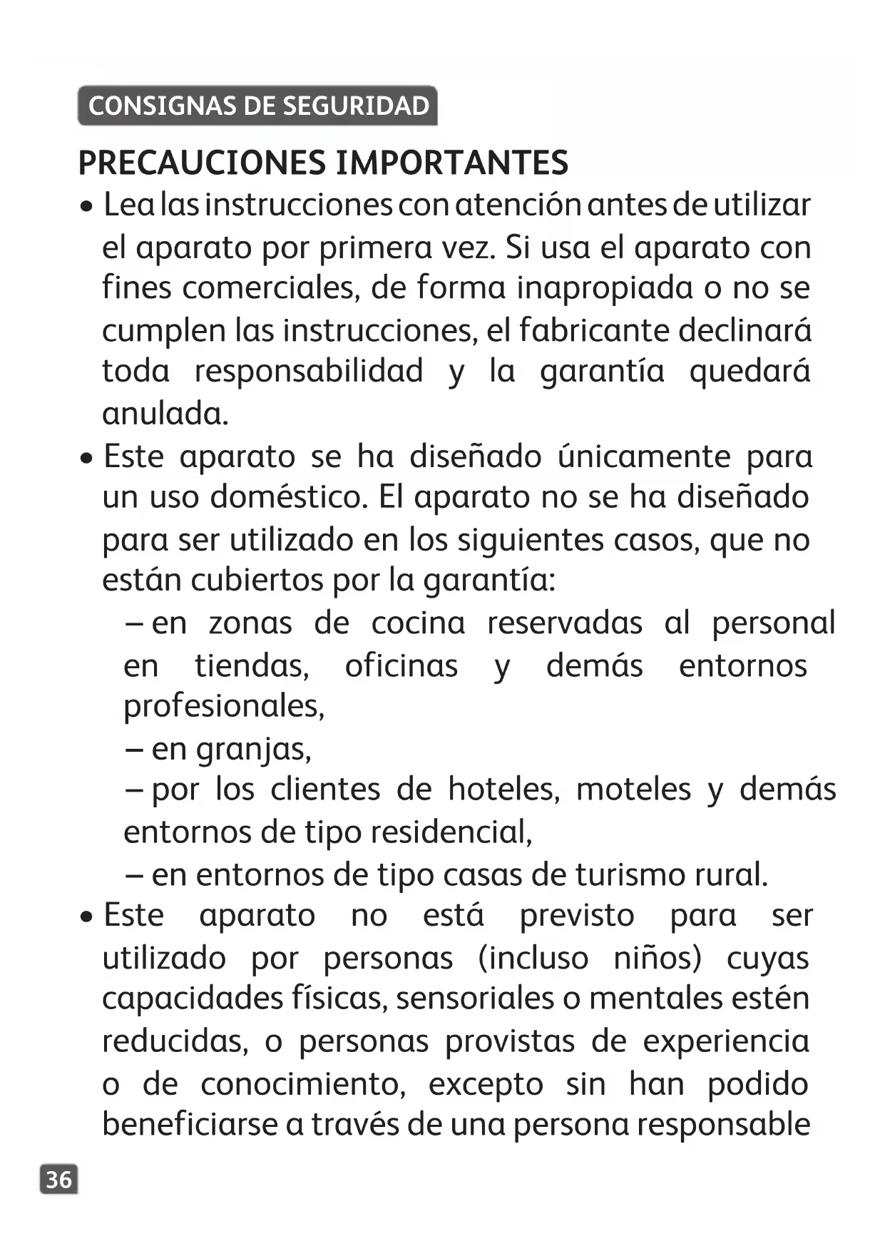 - Este aparato no está previsto para ser utilizado por personas (incluso niños) cuyas capacidades físicas, sensoriales o mentales estén reducidas, o personas provistas de experiencia o de conocimiento, excepto sin han podido beneficiarse a través de una persona responsable37