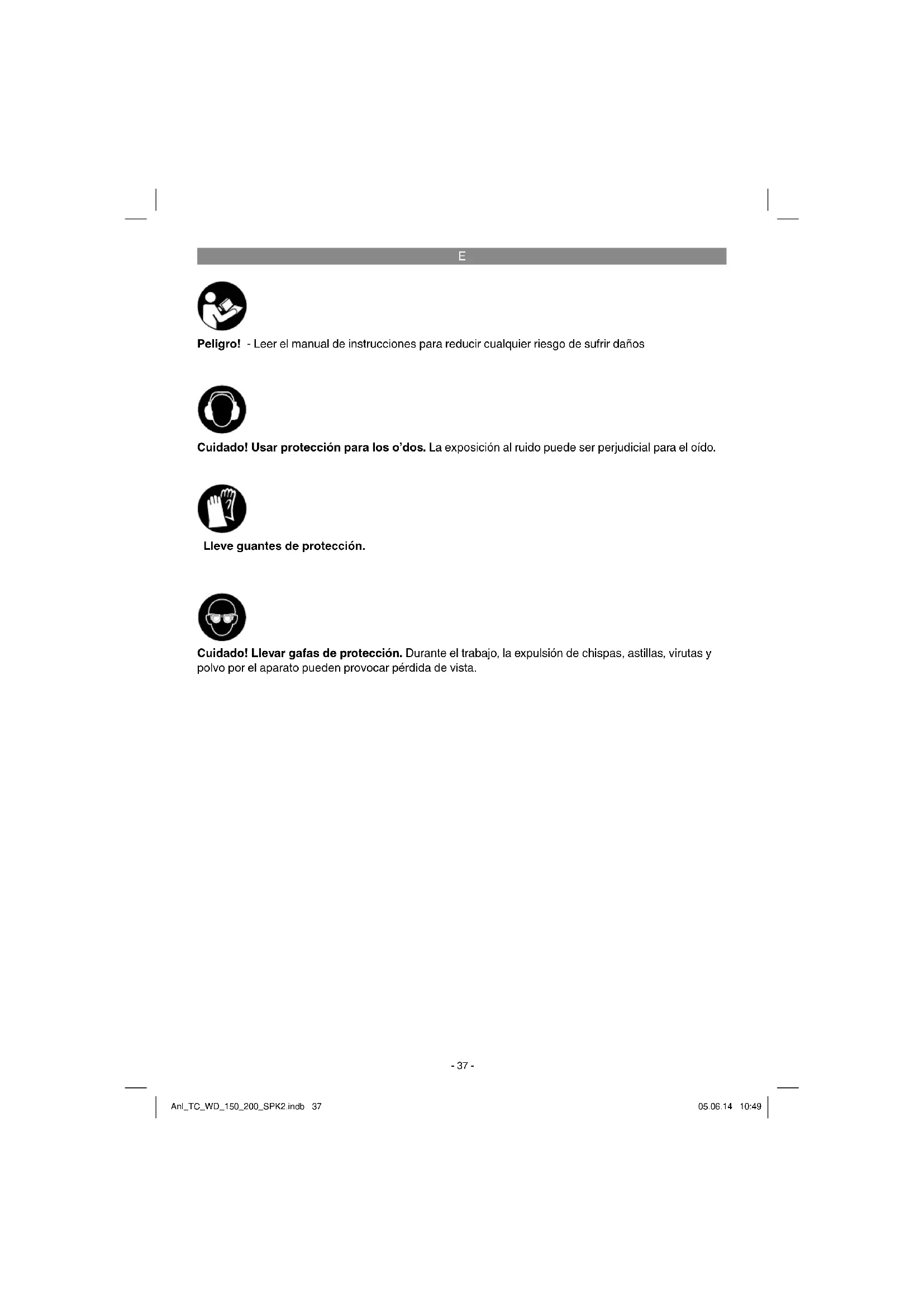 Peligro! - Leer el manual de instrucciones para reducir cualquier riesgo de sufrir daños Cuidado! Usar protección para los oídos. La exposición al ruido puede ser perjudicial para el oído. Cuidado! Llevar gafas de protección. Durante el trabajo, la expulsión de chispas, astillas, virutas y polvo por el aparato pueden provocar pérdida de vista. Lleve guantes de protección. Anl_TC_WD_150_200_SPK2.indb 37Anl_TC_WD_150_200_SPK2.indb 37 05.06.14 10:4905.06.14 10:49E
