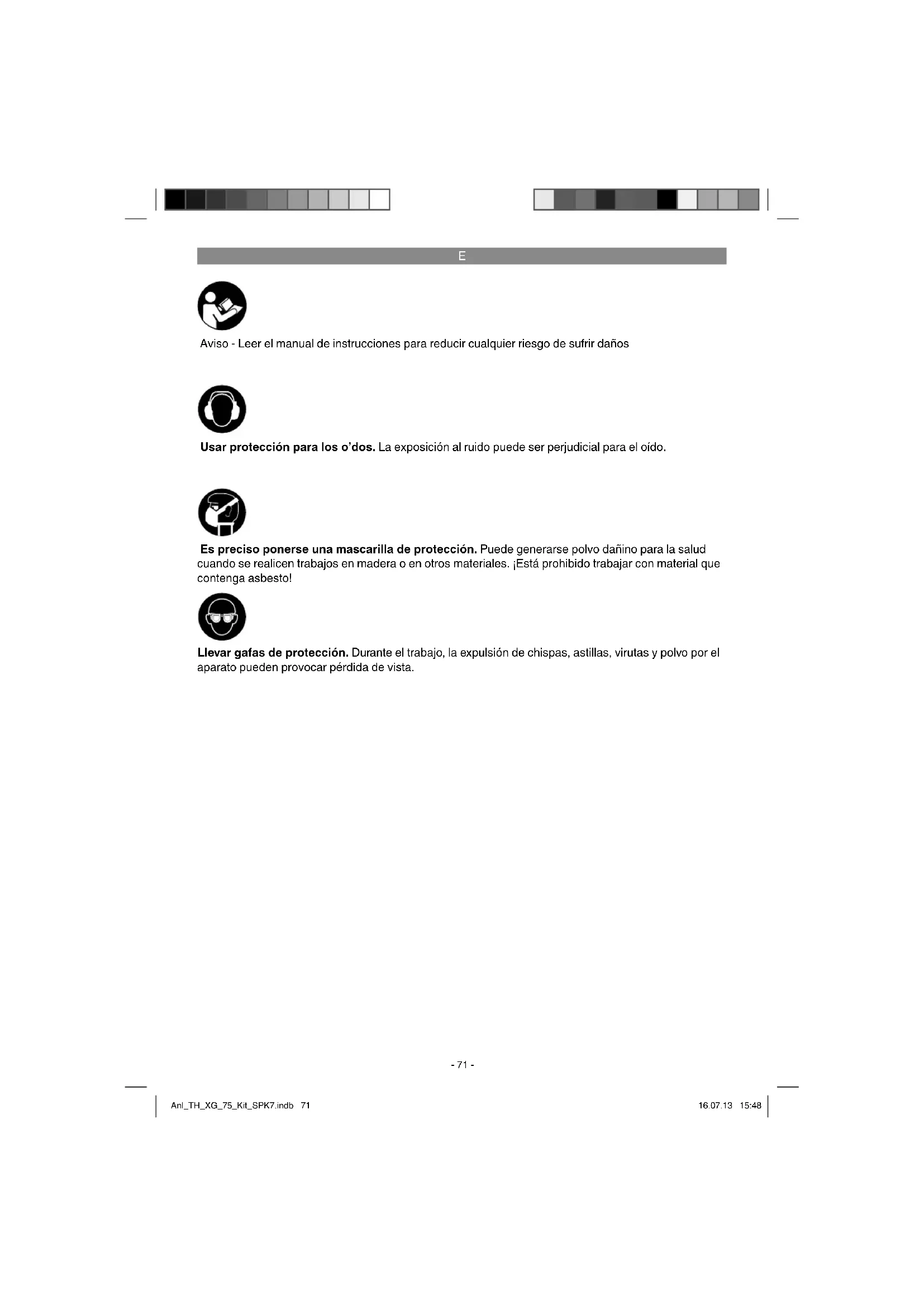 Aviso - Leer el manual de instrucciones para reducir cualquier riesgo de sufrir daños Usar protección para los oídos. La exposición al ruido puede ser perjudicial para el oído. Llevar gafas de protección. Durante el trabajo, la expulsión de chispas, astillas, virutas y polvo por el aparato pueden provocar pérdida de vista. Es preciso ponerse una mascarilla de protección. Puede generarse polvo dañino para la salud cuando se realicen trabajos en madera o en otros materiales. ¡Está prohibido trabajar con material que contenga asbesto! Anl_TH_XG_75_Kit_SPK7.indb 71Anl_TH_XG_75_Kit_SPK7.indb 71 16.07.13 15:4816.07.13 15:48E