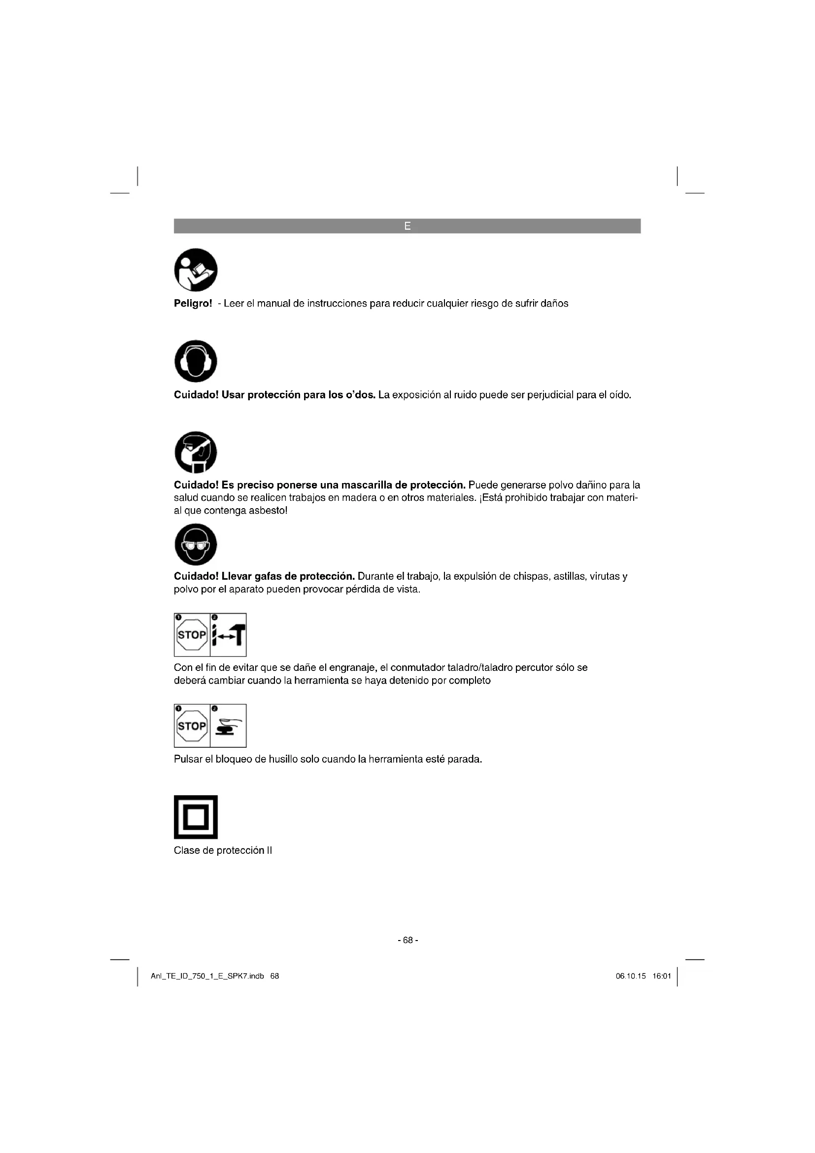 Peligro! - Leer el manual de instrucciones para reducir cualquier riesgo de sufrir daños Cuidado! Usar protección para los oídos. La exposición al ruido puede ser perjudicial para el oído. Cuidado! Llevar gafas de protección. Durante el trabajo, la expulsión de chispas, astillas, virutas y polvo por el aparato pueden provocar pérdida de vista. Cuidado! Es preciso ponerse una mascarilla de protección. Puede generarse polvo dañino para la salud cuando se realicen trabajos en madera o en otros materiales. ¡Está prohibido trabajar con materi- al que contenga asbesto! Con el fi n de evitar que se dañe el engranaje, el conmutador taladro/taladro percutor sólo se deberá cambiar cuando la herramienta se haya detenido por completo Clase de protección II Pulsar el bloqueo de husillo solo cuando la herramienta esté parada. Anl_TE_ID_750_1_E_SPK7.indb 68Anl_TE_ID_750_1_E_SPK7.indb 68 06.10.15 16:0106.10.15 16:01E