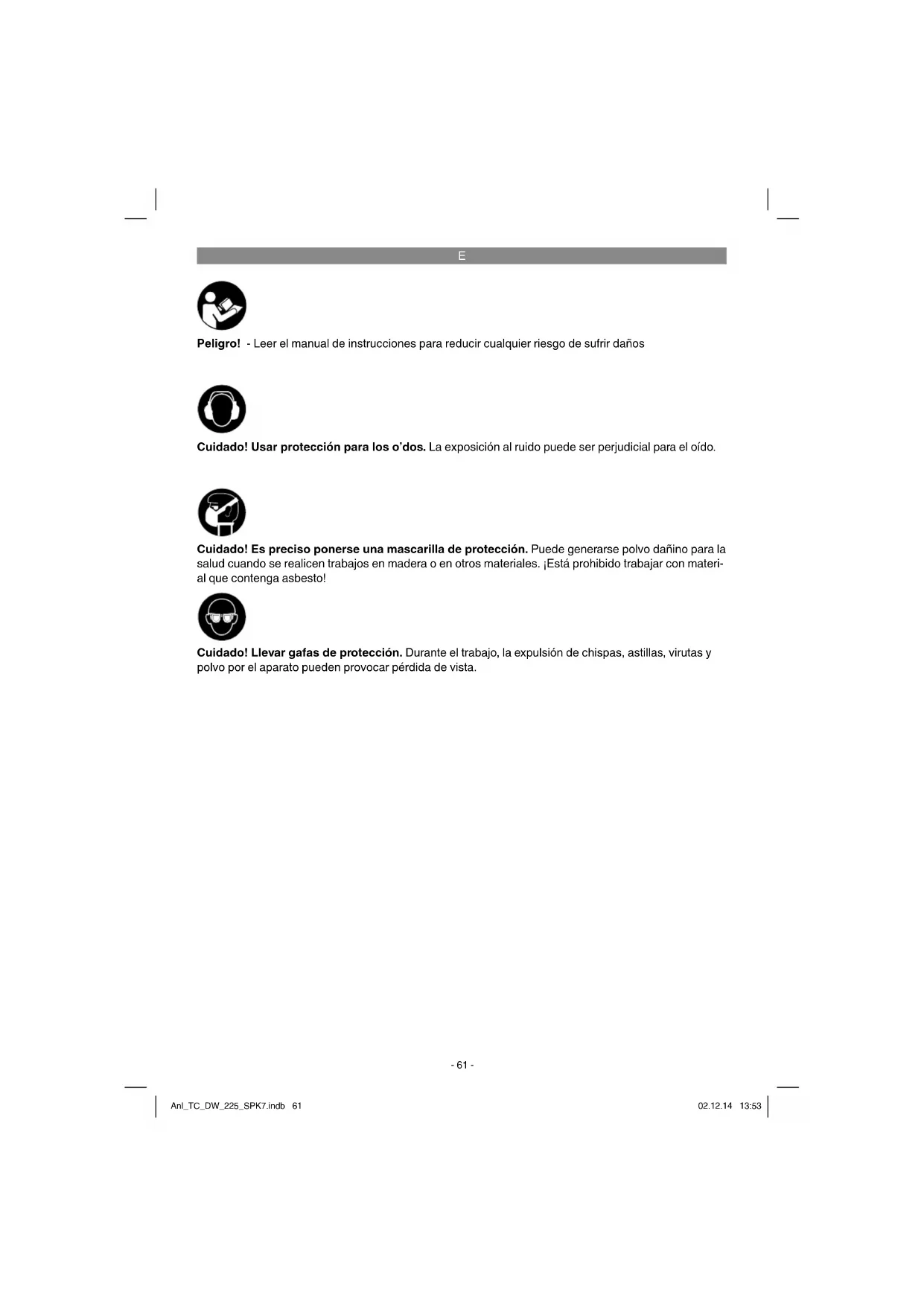 Peligro! - Leer el manual de instrucciones para reducir cualquier riesgo de sufrir daños Cuidado! Usar protección para los oídos. La exposición al ruido puede ser perjudicial para el oído. Cuidado! Llevar gafas de protección. Durante el trabajo, la expulsión de chispas, astillas, virutas y polvo por el aparato pueden provocar pérdida de vista. Cuidado! Es preciso ponerse una mascarilla de protección. Puede generarse polvo dañino para la salud cuando se realicen trabajos en madera o en otros materiales. ¡Está prohibido trabajar con materi- al que contenga asbesto! Anl_TC_DW_225_SPK7.indb 61Anl_TC_DW_225_SPK7.indb 61 02.12.14 13:5302.12.14 13:53E