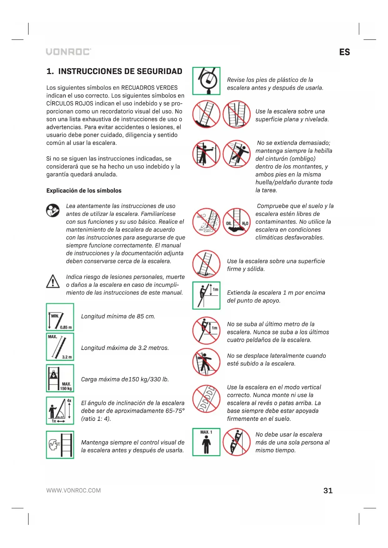 Los siguientes símbolos en RECUADROS VERDES indican el uso correcto. Los siguientes símbolos en CÍRCULOS ROJOS indican el uso indebido y se pro- porcionan como un recordatorio visual del uso. No son una lista exhaustiva de instrucciones de uso o advertencias. Para evitar accidentes o lesiones, el usuario debe poner cuidado, diligencia y sentido común al usar la escalera. Si no se siguen las instrucciones indicadas, se considerará que se ha hecho un uso indebido y la garantía quedará anulada. Explicación de los símbolos Lea atentamente las instrucciones de uso antes de utilizar la escalera. Familiarícese con sus funciones y su uso básico. Realice el mantenimiento de la escalera de acuerdo con las instrucciones para asegurarse de que siempre funcione correctamente. El manual de instrucciones y la documentación adjunta deben conservarse cerca de la escalera. Indica riesgo de lesiones personales, muerte o daños a la escalera en caso de incumpli- miento de las instrucciones de este manual. Longitud mínima de 85 cm. Longitud máxima de 3.2 metros. Carga máxima de150 kg/330 lb. El ángulo de inclinación de la escalera debe ser de aproximadamente 65-75° (ratio 1: 4). Mantenga siempre el control visual de la escalera antes y después de usarla. Revise los pies de plástico de la escalera antes y después de usarla. Use la escalera sobre una superficie plana y nivelada. No se extienda demasiado; mantenga siempre la hebilla del cinturón (ombligo) dentro de los montantes, y ambos pies en la misma huella/peldaño durante toda la tarea. Compruebe que el suelo y la escalera estén libres de contaminantes. No utilice la escalera en condiciones climáticas desfavorables. Use la escalera sobre una superficie firme y sólida. Extienda la escalera 1 m por encima del punto de apoyo. No se suba al último metro de la escalera. Nunca se suba a los últimos cuatro peldaños de la escalera. No se desplace lateralmente cuando esté subido a la escalera. Use la escalera en el modo vertical correcto. Nunca monte ni use la escalera al revés o patas arriba. La base siempre debe estar apoyada firmemente en el suelo. No debe usar la escalera más de una sola persona al mismo tiempo.32