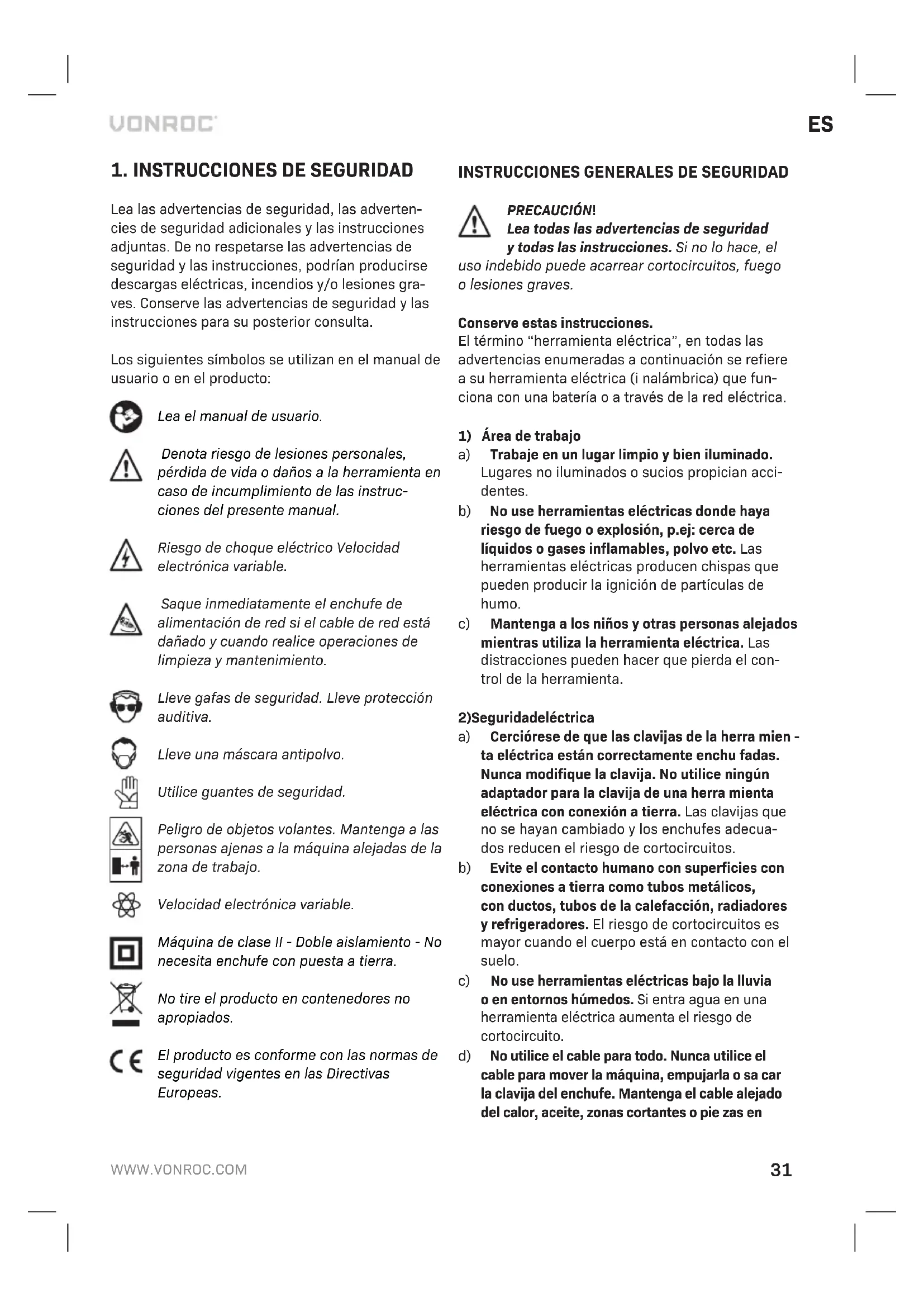 - Si se han utilizado piezas de repuesto no origi- nales. La presente constituye la única garantía implícita y explícita que ofrece la compañía. No existen otras garantías explícitas o implícitas que excedan las citadas aquí, incluidas las garantías implícitas de comerciabilidad e idoneidad para una finalidad en especial. VONROC no será considerada responsable en ningún caso por daños incidentales o conse- cuentes. Los recursos a disposición de los distri- buidores se limitan a la reparación o a la sustitu- ción de las unidades o piezas no conformes. El producto y el manual de usuario están sujetos a variaciones. Las especificaciones pueden variarse sin previo aviso.38
