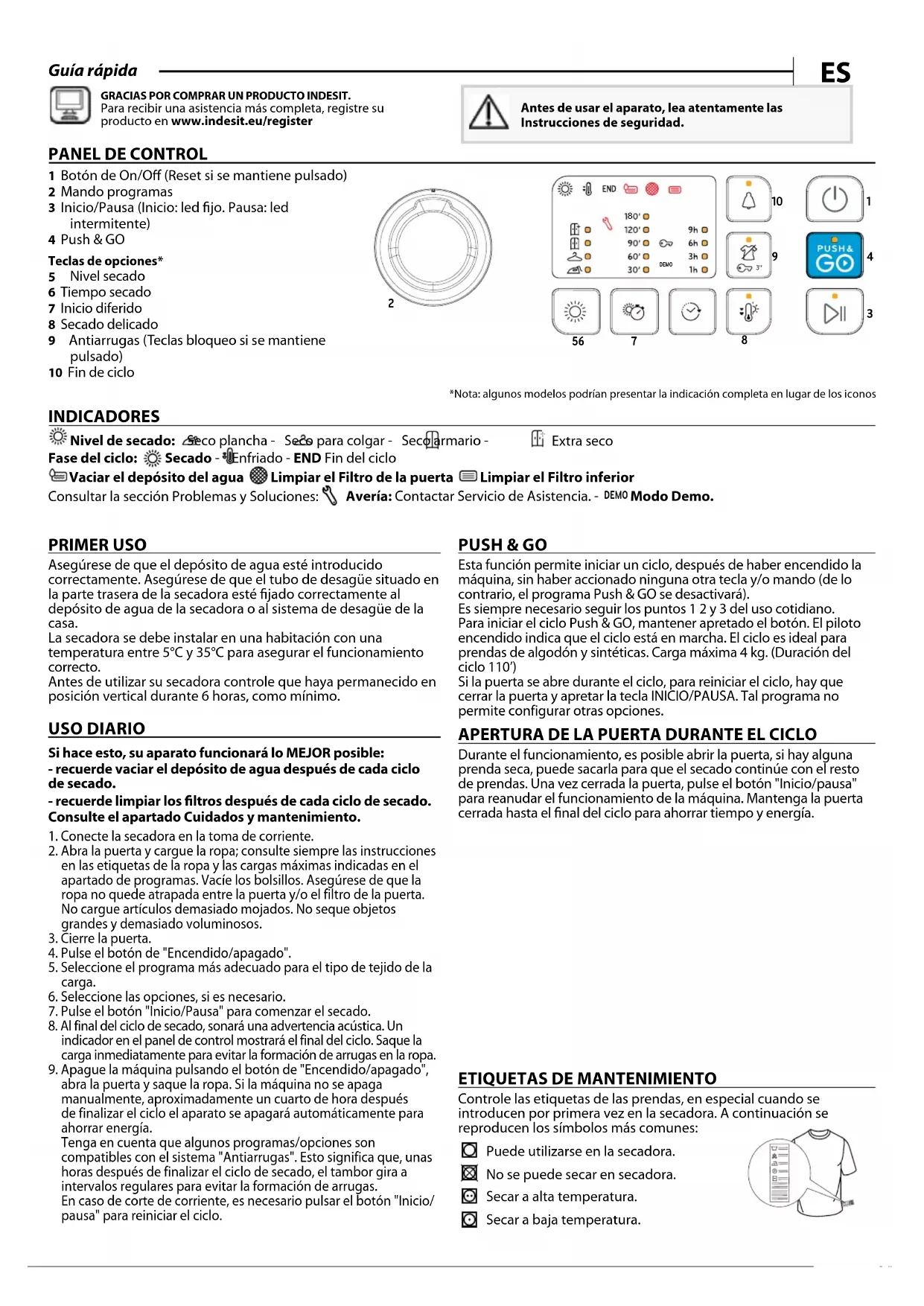 Retirar el filtro de la puerta y colocar el soporte. Los cordones deben introducirse en el interior de las zapatillas: las puntas deben dirigirse hacia abajo y las suelas hacia el frente. No añadir otra ropa u otras zapatillas dentro del cesto. Volver a colocar el filtro de la puerta después del secado. PROGRAMAS La duración de estos programas depende del tamaño de la carga, del tipo de tejidos, de la velocidad del centrifugado usado en su lavadora y de las otras opciones seleccionadas. En los modelos con pantalla, la duración de los ciclos se muestra en el panel de control. El tiempo restante es monitorizado constantemente y modificado durante el ciclo de secado para mostrar la mejor estimación posible. De forma opcional puede aumentar o disminuir el nivel de secado utilizando la opción correspondiente, en el caso de que todas las cargas en los ciclos automáticos queden siempre menos secas o más secas de lo que le gustaría. Eco kg Max* Tiempo 195' Programa de algodón estándar, apto para secar ropa normalmente mojada de algodón. El programa más eficiente en términos de consumo de energía para secar la ropa de algodón. Los valores de la etiqueta de energía se basan en este programa. NOTA: Para una eficiencia energética óptima, este ciclo está configurado por defecto en el nivel "Seco armario". Para un nivel de secado más alto, recomendamos utilizar el ciclo Algodón. Algodón kg Max* Tiempo 190' Ciclo adecuado para secar prendas de todo tipo de algodón, salen listas para colocarlas en el armario. Variada kg 4 Tiempo 140' Este es el programa ideal para secar juntos los tejidos de algodón y los sintéticos. Sintéticos kg 4 Tiempo 75' Para secar ropa con tejidos sintéticos. Sintéticos Mini kg 2 Tiempo 65' Secado económico para pequeñas cargas de ropa. Delicados kg 2 Tiempo 80' Para secar ropa delicada que requiere un tratamiento suave. Lana kg 1 Tiempo 115' Para secar prendas de lana. Se aconseja dar la vuelta a las prendas antes del secado. Dejar que los bordes más pesados que estuvieran aún húmedos se sequen naturalmente. Refrescar Programa breve adecuado para refrescar fibras y prendas mediante la emisión de aire fresco. No utilizar con prendas aún mojadas. Puede utilizarse con cualquier dimensión de carga, pero es más eficaz con cargas pequeñas. El ciclo dura unos 20 minutos. Vaqueros kg 3 Tiempo 130' Para secar ropa vaquera de algodón y prendas de material resistente similar al tejido vaquero como pantalones y chaquetas. Edredón Tiempo 180' Para secar prendas voluminosas como un edredón. Bebé kg 2 Tiempo 125' Un programa concebido específicamente para secar la ropa de vestir y de cama de recién nacidos (algodón y chenilla) y las prendas delicadas. No secar artículos con revestimientos de plástico. Camisas kg 3 Tiempo 140' Este programa está dedicado a las camisas de algodón o mezcla algodón/sintéticos. Deporte kg 4 Tiempo 95' Para secar ropa de deporte de tejido sintético o algodón. Calzado Deportivo 1 pareja Tiempo 100' Este es un programa para secar un par de zapatillas deportivas. Las zapatillas deben lavarse y centrifugarse a una velocidad de centrifugado mínima de 400 revoluciones. Debe usarse con el correspondiente soporte para zapatos suministrado. Secar solo zapatillas deportivas de material sintético o tela. 45’ Rápido 45’ kg 1 Un programa rápido a tiempo, ideal para secar prendas centrifugadas a alta velocidad en la lavadora, por ejemplo las camisas utilizadas en una semana de trabajo.GRACIAS POR COMPRAR UN PRODUCTO INDESIT. Para recibir una asistencia más completa, registre su producto en www.indesit.eu/register Puede consultar los reglamentos, la documentación estándar, así como pedir piezas de repuesto, mediante alguna de las siguientes formas: