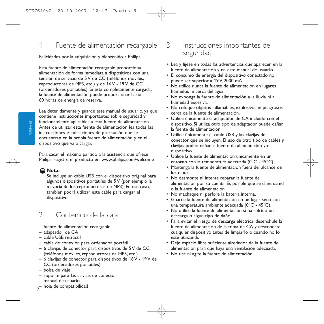 Antes de utilizar esta fuente de alimentación lea todas las instrucciones e indicaciones de precaución que se encuentran en la propia fuente de alimentación y en el dispositivo que va a cargar. Para sacar el máximo partido a la asistencia que ofrece Philips, registre el producto en: www.philips.com/welcome Nota: Se incluye un cable USB con el dispositivo original para algunos dispositivos portátiles de 5 V (por ejemplo la mayoría de los reproductores de MP3). En ese caso, también podrá utilizar este cable para cargar el dispositivo.