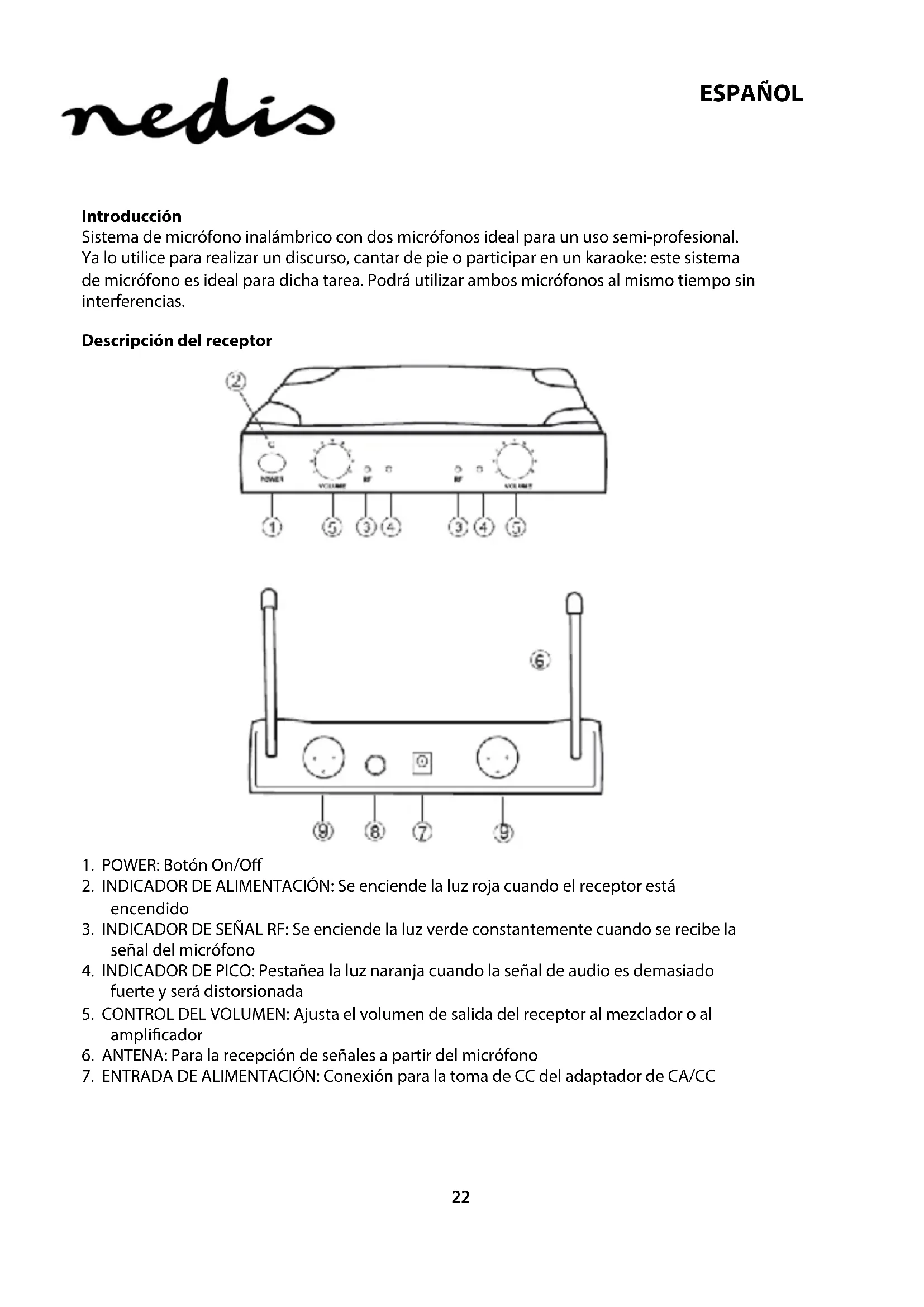 - INDICADOR DE SENAL RF: Se enciende la luz verde constantemente cuando se recibe la seals del microfondo
