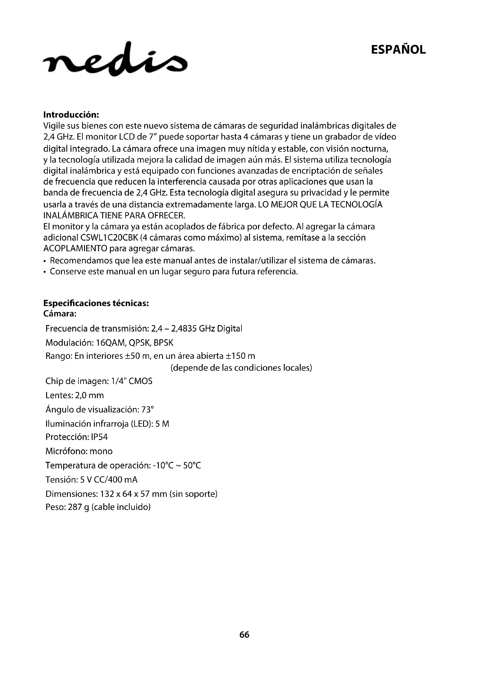 - Conserve este manual en un lugar seguro para futura referencia. Especicaciones técnicas: Cámara: Frecuencia de transmisión: 2,4 – 2,4835 GHz Digital Modulación: 16QAM, QPSK, BPSK Rango: En interiores ±50 m, en un área abierta ±150 m (depende de las condiciones locales) Chip de imagen: 1/4" CMOS Lentes: 2,0 mm Ángulo de visualización: 73° Iluminación infrarroja (LED): 5 M Protección: IP54 Micrófono: mono Temperatura de operación: -10°C ~ 50°C Tensión: 5 V CC/400 mA Dimensiones: 132 x 64 x 57 mm (sin soporte) Peso: 287 g (cable incluido)67 ESPAÑOL Monitor LCD: Frecuencia de recepción: 2,4 – 2,4835 GHz Digital Canales: 4 Tamaño: TFT/LCD de 7” Resolución máx.: 800 RGB (H) * 480 (V) píxeles Tarjeta SD: hasta 32 GB (no incluida) Velocidad de cuadro de vídeo: 25 fps (máx.) 10 fps (4 cámaras) Velocidad de cuadro de grabación: 25 fps por canal Resolución de vídeo: CIF/VGA Formato de vídeo: AVI USB: 2,0 Idioma de menú: inglés, alemán, francés y holandés Nivel de salida de vídeo: 1 Vp-p/75 Ohm Nivel de salida de audio: 2 Vrms a 600ohm mono Conector de salida de audio/ vídeo: cha de 2,5 mm (cable de 2,5 mm a 3 RCA incluido) Rango: En interiores ±50 m, en un área abierta ±150 m (depende de las condiciones locales) Temperatura de operación: 0°C a +40°C Tensión: 5 V CC/650 mA Dimensiones: 214x157x26 mm Peso: 488 g Precauciones de seguridad:
