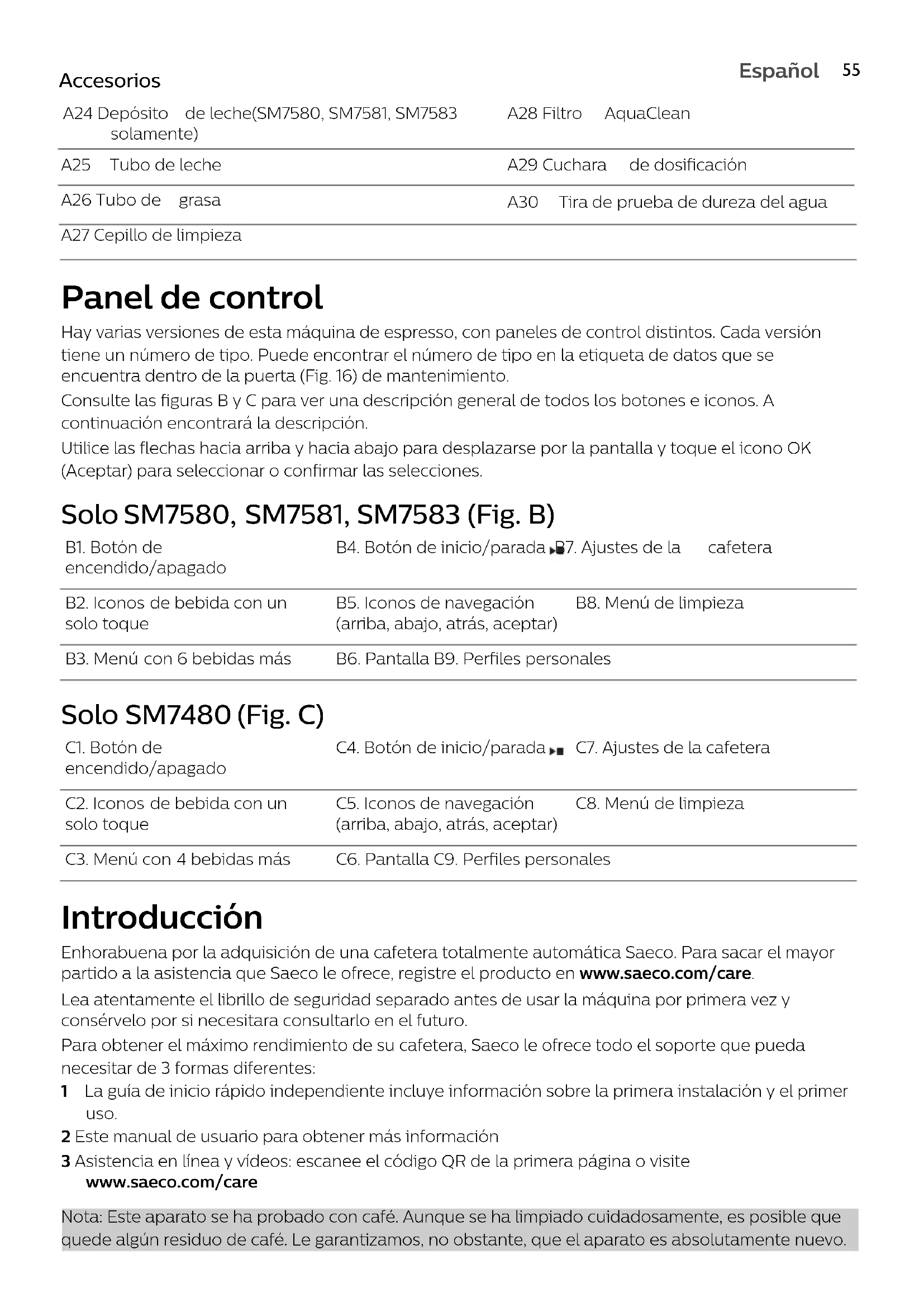 Panel de control Hay varias versiones de esta máquina de espresso, con paneles de control distintos. Cada versióntiene un número de tipo. Puede encontrar el número de tipo en la etiqueta de datos que seencuentra dentro de la puerta (Fig. 16) de mantenimiento.Consulte las figuras B y C para ver una descripción general de todos los botones e iconos. Acontinuación encontrará la descripción. Utilice las flechas hacia arriba y hacia abajo para desplazarse por la pantalla y toque el icono OK(Aceptar) para seleccionar o confirmar las selecciones. Solo SM7580, SM7581, SM7583 (Fig. B) B1. Botón deencendido/apagadoB4. Botón de inicio/parada B7. Ajustes de la cafeteraB2. Iconos de bebida con unsolo toqueB5. Iconos de navegación(arriba, abajo, atrás, aceptar) B8. Menú de limpiezaB3. Menú con 6 bebidas más B6. Pantalla B9. Perfiles personales Solo SM7480 (Fig. C) C1. Botón deencendido/apagadoC4. Botón de inicio/parada C7. Ajustes de la cafeteraC2. Iconos de bebida con unsolo toqueC5. Iconos de navegación(arriba, abajo, atrás, aceptar) C8. Menú de limpiezaC3. Menú con 4 bebidas másC6. Pantalla C9. Perfiles personales Introducción Enhorabuena por la adquisición de una cafetera totalmente automática Saeco. Para sacar el mayorpartido a la asistencia que Saeco le ofrece, registre el producto en www.saeco.com/care. Lea atentamente el librillo de seguridad separado antes de usar la máquina por primera vez yconsérvelo por si necesitara consultarlo en el futuro.Para obtener el máximo rendimiento de su cafetera, Saeco le ofrece todo el soporte que puedanecesitar de 3 formas diferentes: 1 La guía de inicio rápido independiente incluye información sobre la primera instalación y el primer uso. 2 Este manual de usuario para obtener más información3 Asistencia en línea y vídeos: escanee el código QR de la primera página o visitewww.saeco.com/careNota: Este aparato se ha probado con café. Aunque se ha limpiado cuidadosamente, es posible quequede algún residuo de café. Le garantizamos, no obstante, que el aparato es absolutamente nuevo. A30 Tira de prueba de dureza del aguaA26 Tubo de grasaA27 Cepillo de limpieza Accesorios A24 Depósito de leche(SM7580, SM7581, SM7583solamente)A28 Filtro AquaClean A25 Tubo de lecheA29 Cuchara de dosificaciónPrimera instalación Para preparar la cafetera para el uso tiene que realizar unos cuantos y sencillos pasos, como llenar el circuito de agua y activar el filtro AquaClean. Estos pasos se muestran en la guía de inicio rápido separada. Si quiere obtener el café más delicioso, al principio deberá preparar 5 cafés para permitir que la máquina complete su ajuste automático. La máquina está concebida para extraer el mejor sabor de sus granos de café. Por consiguiente, es recomendable que no realice ajustes en el molinillo hasta que haya preparado entre 100 y 150 tazas de café (aprox. 1 mes de uso). Filtro AquaClean El filtro AquaClean se ha diseñado para reducir los depósitos de cal de la cafetera y dispensar agua filtrada para preservar el aroma y el sabor de cada taza de café. Si utiliza una serie de 8 filtros AquaClean como señala la cafetera y se indica en este manual del usuario, no tendrá que descalcificar el aparato hasta las 5000 tazas. Con cada filtro se puede disfrutar de hasta 625 tazas, dependiendo de la variedad de café elegida y de la frecuencia con que se enjuague y limpie la cafetera. Preparación del filtro AquaClean para la activación Antes de colocar el filtro AquaClean en el depósito de agua es preciso prepararlo: 1 Sacuda el filtro durante unos 5 segundos (Fig. 1). 2 Sumerja completamente el filtro boca abajo en una jarra con agua fría durante al menos 30segundos. Espere a que no salgan (Fig. 2) más burbujas de aire. 3 Empuje el filtro en la conexión hasta el punto (Fig. 3) más bajo posible. Activación del filtro AquaClean Es preciso que active cada filtro AquaClean nuevo que utilice. Al activar el filtro AquaClean, la cafetera controla la capacidad del filtro AquaClean y el número de filtros usados. Existen 3 maneras de activar el filtro AquaClean.