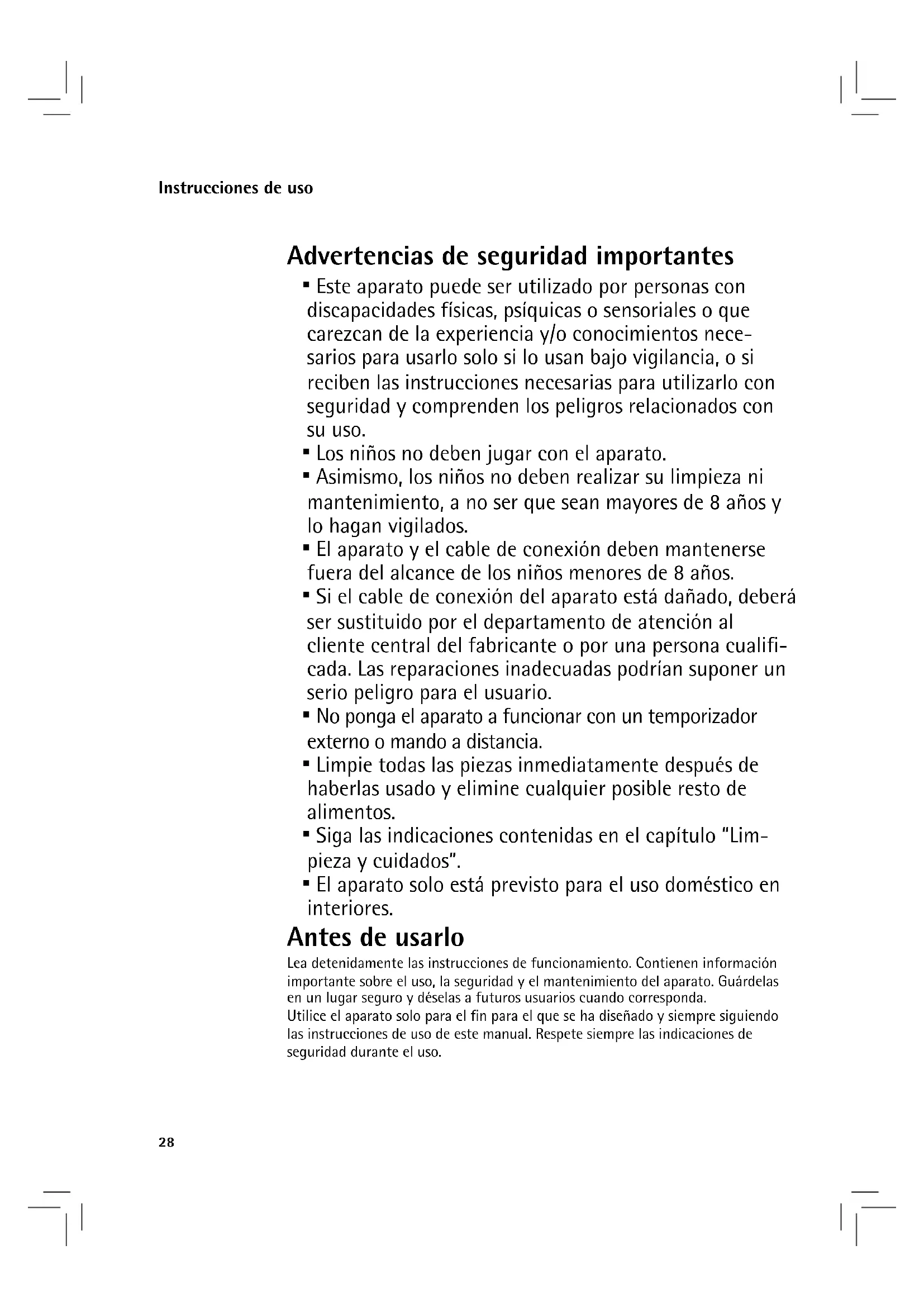 - El aparato solo está previsto para el uso doméstico en interiores. Antes de usarlo Lea detenidamente las instrucciones de funcionamiento. Contienen información importante sobre el uso, la seguridad y el mantenimiento del aparato. Guárdelas en un lugar seguro y déselas a futuros usuarios cuando corresponda. Utilice el aparato solo para el fin para el que se ha diseñado y siempre siguiendo las instrucciones de uso de este manual. Respete siempre las indicaciones de seguridad durante el uso.29