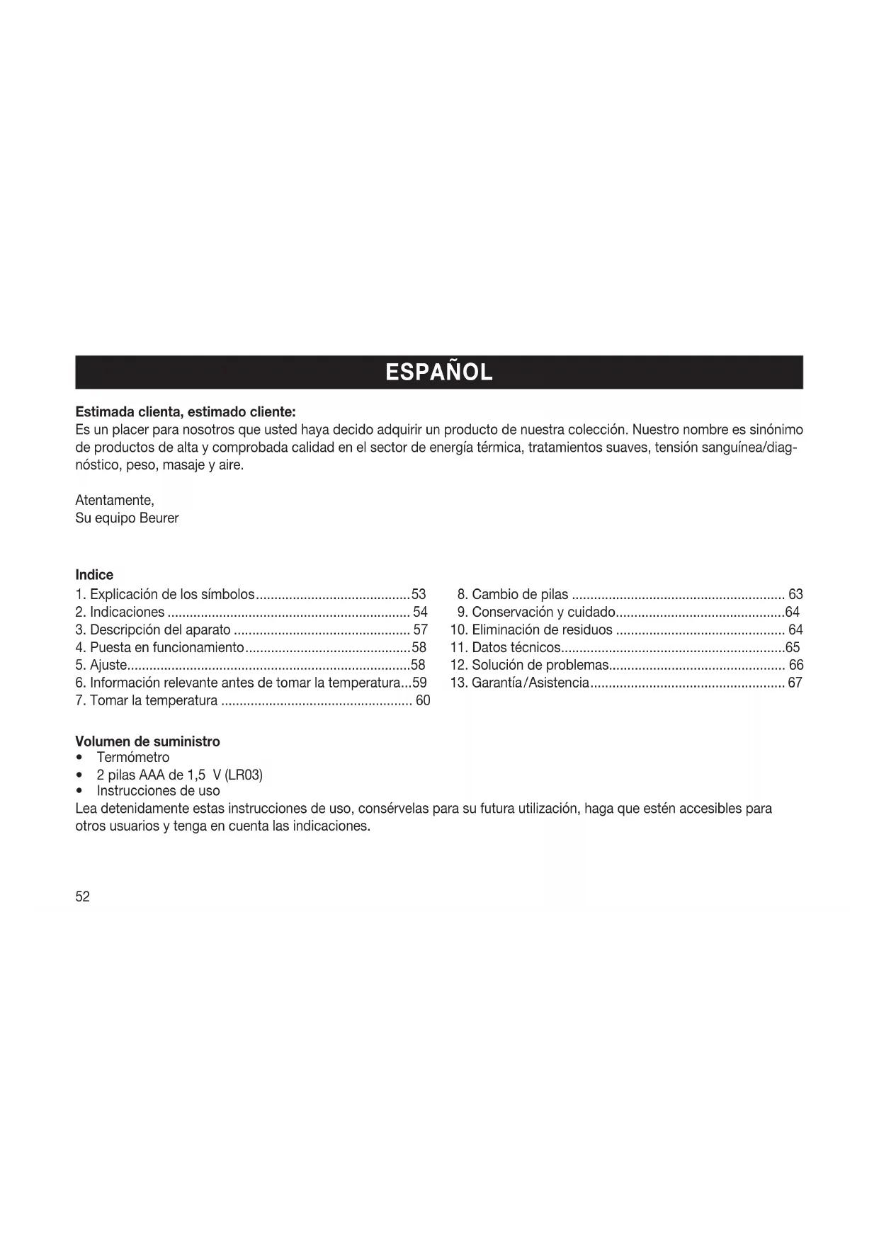Estimada clienta, estimado cliente: Es un placer para nosotros que usted haya decido adquirir un producto de nuestra colección. Nuestro nombre es sinónimo de productos de alta y comprobada calidad en el sector de energía térmica, tratamientos suaves, tensión sanguínea/diag- nóstico, peso, masaje y aire. Atentamente, Su equipo Beurer Volumen de suministro