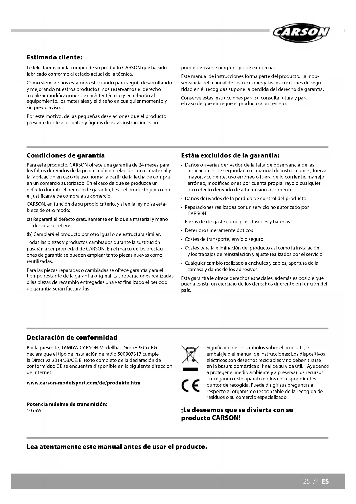 - Cualquier cambio realizado a enchufes y cables, apertura de la carcasa y daños de los adhesivos. Esta garantía le ofrece derechos especiales, además es posible que pueda existir un ejercicio de los derechos diferente en función del país. Lea atentamente este manual antes de usar el producto. Por la presente, TAMIYA-CARSON Modellbau GmbH & Co. KG declara que el tipo de instalación de radio 500907317 cumple la Directiva 2014/53/CE. El texto completo de la declaración de conformidad CE se encuentra disponible en la siguiente dirección de internet: www.carson-modelsport.com/de/produkte.htm Potencia máxima de transmisión: 10 mW Significado de los símbolos sobre el producto, el embalaje o el manual de instrucciones: Los dispositivos eléctricos son desechos reciclables y no deben tirarse en la basura doméstica al final de su vida útil. Ayúdenos a proteger el medio ambiente y a preservar los recursos entregando este aparato en los correspondientes puntos de recogida. Puede dirigir sus preguntas al respecto al organismo responsable de la recogida de residuos o su comercio especializado. ¡Le deseamos que se divierta con su producto CARSON! Declaración de conformidadES // 26