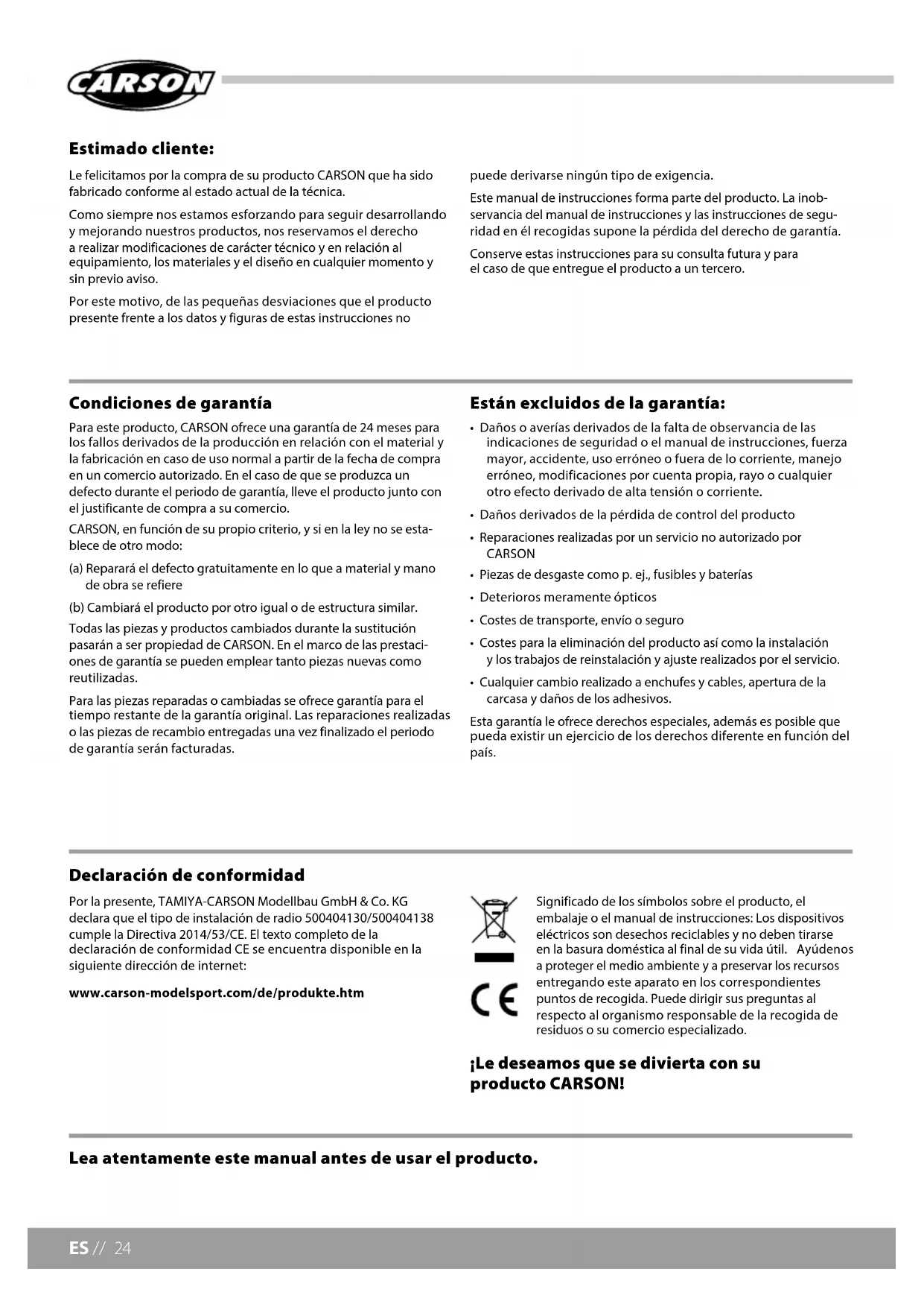 - Cualquier cambio realizado a enchufes y cables, apertura de la carcasa y daños de los adhesivos. Esta garantía le ofrece derechos especiales, además es posible que pueda existir un ejercicio de los derechos diferente en función del país. Lea atentamente este manual antes de usar el producto. Por la presente, TAMIYA-CARSON Modellbau GmbH & Co. KG declara que el tipo de instalación de radio 500404130/500404138 cumple la Directiva 2014/53/CE. El texto completo de la declaración de conformidad CE se encuentra disponible en la siguiente dirección de internet: www.carson-modelsport.com/de/produkte.htm Significado de los símbolos sobre el producto, el embalaje o el manual de instrucciones: Los dispositivos eléctricos son desechos reciclables y no deben tirarse en la basura doméstica al final de su vida útil. Ayúdenos a proteger el medio ambiente y a preservar los recursos entregando este aparato en los correspondientes puntos de recogida. Puede dirigir sus preguntas al respecto al organismo responsable de la recogida de residuos o su comercio especializado. ¡Le deseamos que se divierta con su producto CARSON! Declaración de conformidad25 // ES