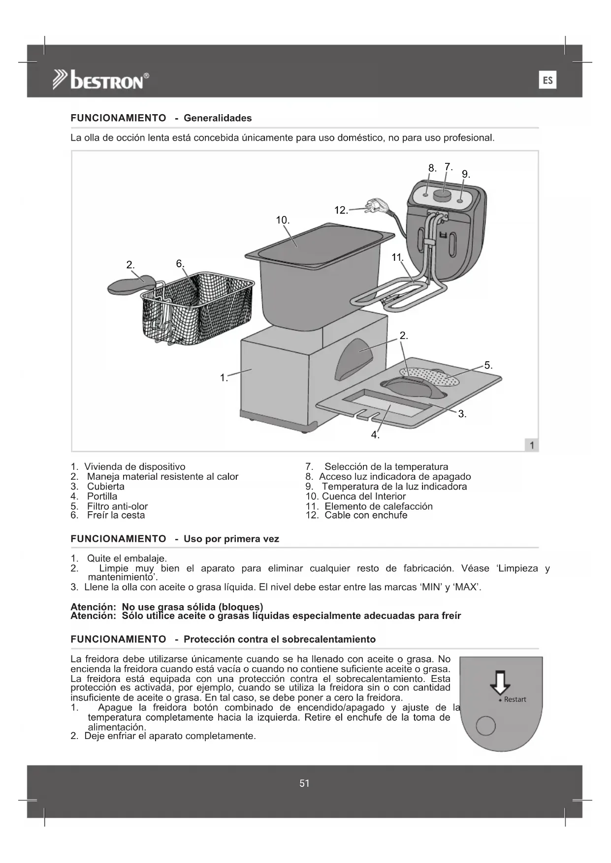 Atención: No use grasa sólida (bloques) Atención: Sólo utilice aceite o grasas líquidas especialmente adecuadas para freír FUNCIONAMIENTO - Protección contra el sobrecalentamiento La freidora debe utilizarse únicamente cuando se ha llenado con aceite o grasa. No encienda la freidora cuando está vacía o cuando no contiene suficiente aceite o grasa. La freidora está equipada con una protección contra el sobrecalentamiento. Esta protección es activada, por ejemplo, cuando se utiliza la freidora sin o con cantidad insuficiente de aceite o grasa. En tal caso, se debe poner a cero la freidora.