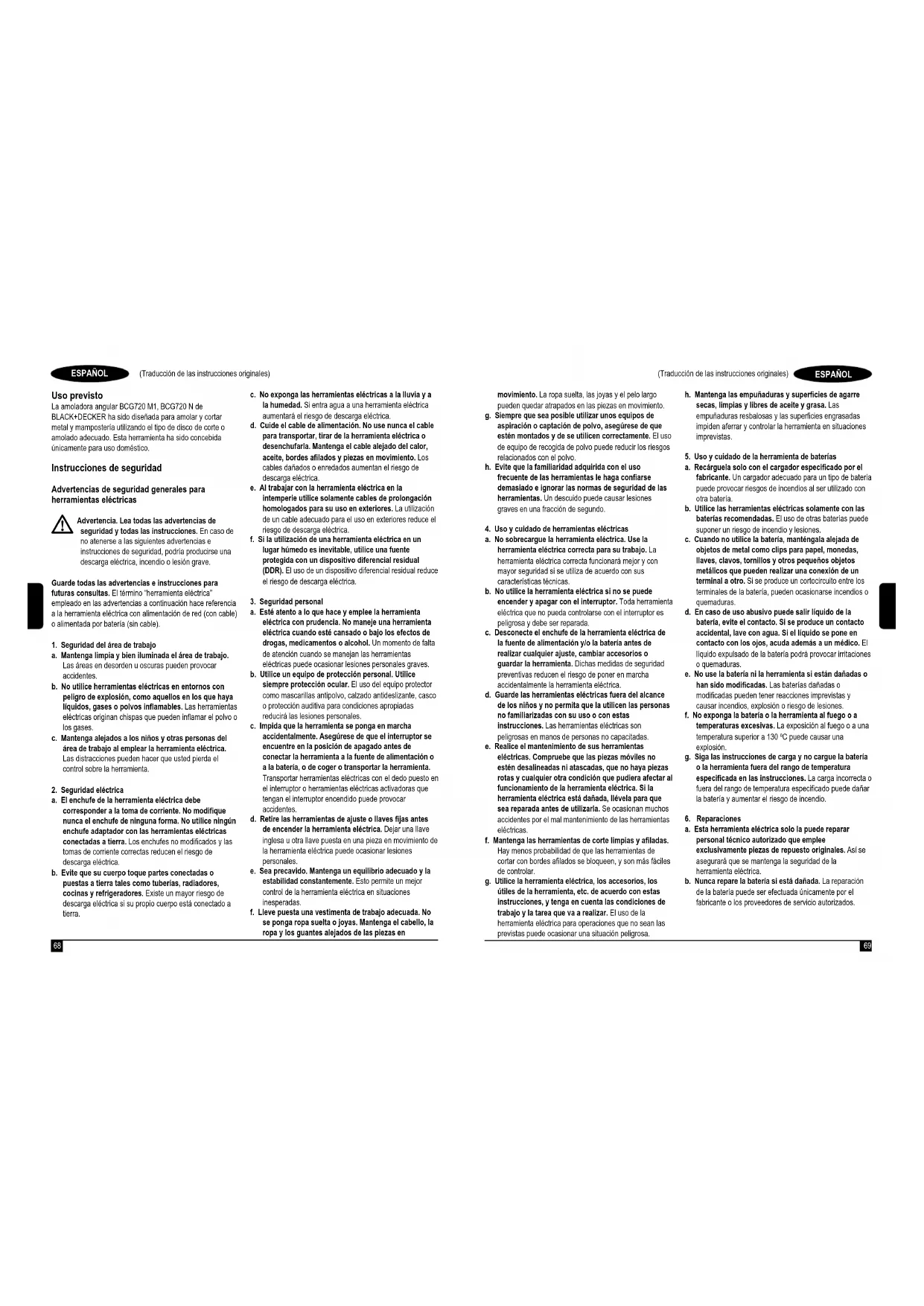 (Traducción de las instrucciones originales) ESPAÑOL Uso previsto La amoladora angular BCG720 M1, BCG720 N de BLACK+DECKER ha sido diseñada para amolar y cortar metal y mampostería utilizando el tipo de disco de corte o amolado adecuado. Esta herramienta ha sido concebida únicamente para uso doméstico. Instrucciones de seguridad Advertencias de seguridad generales para herramientas eléctricas