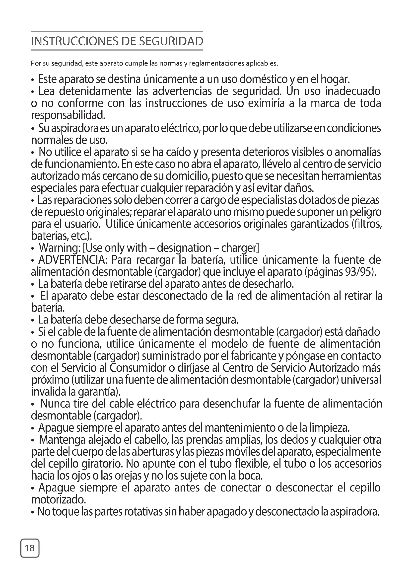 - No lave los elementos del compartimento de polvo ni el ltro protector del motor en el lavaplatos. NORMAS DE SEGURIDAD RELATIVAS A LA BATERÍA