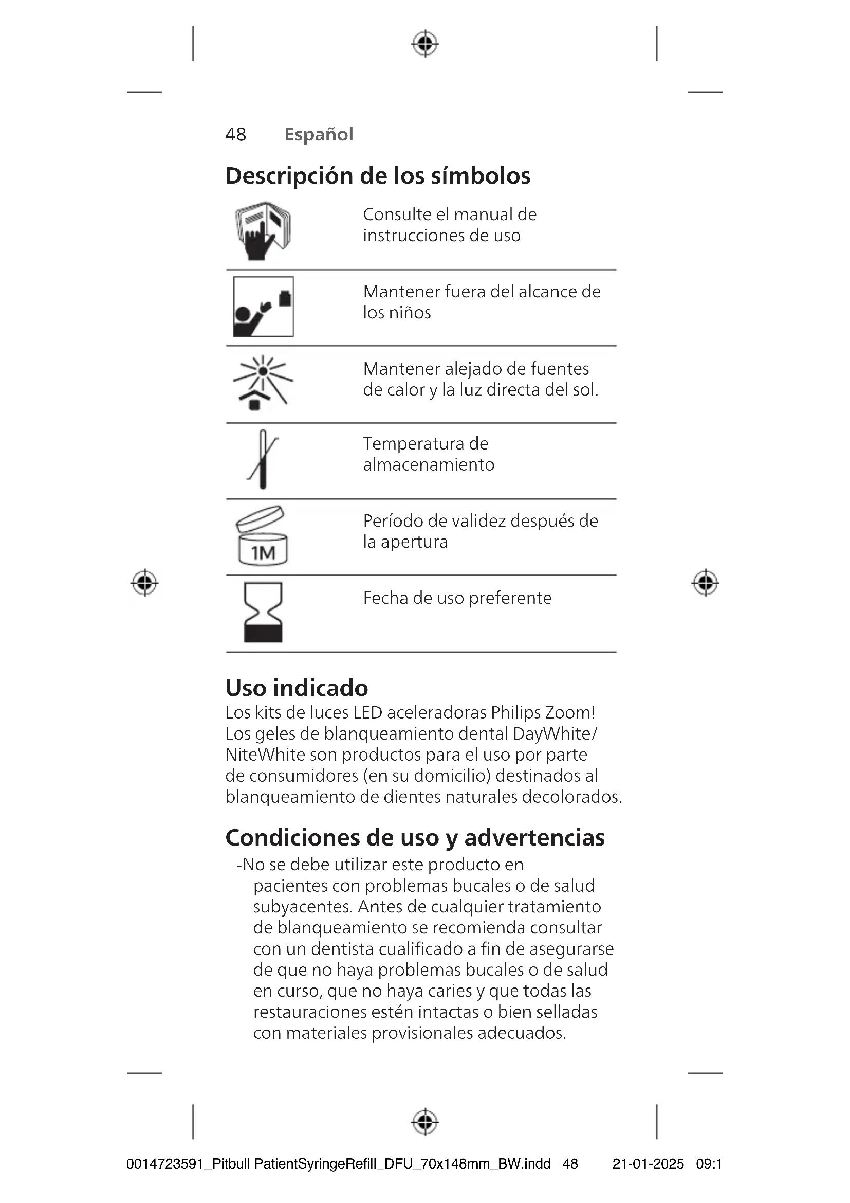 UTILIZAR ESTE PRODUCTO. 300014723591_Pitbull PatientSyringeRefill_DFU_70x148mm_BW.indd 47300014723591_Pitbull PatientSyringeRefill_DFU_70x148mm_BW.indd 47 21-01-2025 09:1121-01-2025 09:1148 Español Español 49 Descripción de los símbolos Consulte el manual de instrucciones de uso Mantener fuera del alcance de los niños Mantener alejado de fuentes de calor y la luz directa del sol. Temperatura de almacenamiento Período de validez después de la apertura Fecha de uso preferente Uso indicado Los kits de luces LED aceleradoras Philips Zoom! Los geles de blanqueamiento dental DayWhite/ NiteWhite son productos para el uso por parte de consumidores (en su domicilio) destinados al blanqueamiento de dientes naturales decolorados. Condiciones de uso y advertencias - No se debe utilizar este producto en pacientes con problemas bucales o de salud subyacentes. Antes de cualquier tratamiento de blanqueamiento se recomienda consultar con un dentista cualicado a n de asegurarse de que no haya problemas bucales o de salud en curso, que no haya caries y que todas las restauraciones estén intactas o bien selladas con materiales provisionales adecuados. - Antes de iniciar el tratamiento, es necesario realizar una prolaxis para comprobar que el paciente no presenta cálculos ni manchas extrínsecas que se puedan eliminar fácilmente. - Venta exclusiva a odontólogos. En cada ciclo de utilización, el primer uso estará restringido a odontólogos o tendrá lugar bajo su supervisión directa, siempre que se garantice un grado de seguridad equivalente. Posteriormente se suministrará al consumidor para completar el ciclo de utilización. - No utilizar en menores de 18 años. - Este producto no debe utilizarse en un plazo de dos semanas antes de una restauración dental o inmediatamente después. - Las mujeres embarazadas o los consumidores habituales de tabaco o alcohol no deben utilizarlo. - No se debe utilizar en pacientes con dientes hipersensibles y dientes con caries de pulpa grandes. - Los productos DayWhite y NiteWhite contienen peróxido de hidrógeno o peróxido de carbamida. Evite el contacto con los ojos y la piel. Enjuagar inmediatamente si el producto entra en contacto con estos. - NiteWhite 10% de peróxido de carbamida: peróxido de hidrógeno al 3,5% liberado. - NiteWhite 16% de peróxido de carbamida: peróxido de hidrógeno al 5,9% liberado. - DayWhite 6%: peróxido de hidrógeno al 6% presente. - Contiene sodium uoride. - Las jeringas pueden sufrir una ligera presión. Quite el tapón con cuidado apuntando lejos de la cara. - Evite tragar el cosmético o parte de él. - Si experimenta vómitos o náuseas, póngalo en conocimiento de su dentista o profesional de la salud de inmediato. 300014723591_Pitbull PatientSyringeRefill_DFU_70x148mm_BW.indd 48300014723591_Pitbull PatientSyringeRefill_DFU_70x148mm_BW.indd 48 21-01-2025 09:1121-01-2025 09:1148 Español Español 49 Descripción de los símbolos Consulte el manual de instrucciones de uso Mantener fuera del alcance de los niños Mantener alejado de fuentes de calor y la luz directa del sol. Temperatura de almacenamiento Período de validez después de la apertura Fecha de uso preferente Uso indicado Los kits de luces LED aceleradoras Philips Zoom! Los geles de blanqueamiento dental DayWhite/ NiteWhite son productos para el uso por parte de consumidores (en su domicilio) destinados al blanqueamiento de dientes naturales decolorados. Condiciones de uso y advertencias - No se debe utilizar este producto en pacientes con problemas bucales o de salud subyacentes. Antes de cualquier tratamiento de blanqueamiento se recomienda consultar con un dentista cualicado a n de asegurarse de que no haya problemas bucales o de salud en curso, que no haya caries y que todas las restauraciones estén intactas o bien selladas con materiales provisionales adecuados. - Antes de iniciar el tratamiento, es necesario realizar una prolaxis para comprobar que el paciente no presenta cálculos ni manchas extrínsecas que se puedan eliminar fácilmente. - Venta exclusiva a odontólogos. En cada ciclo de utilización, el primer uso estará restringido a odontólogos o tendrá lugar bajo su supervisión directa, siempre que se garantice un grado de seguridad equivalente. Posteriormente se suministrará al consumidor para completar el ciclo de utilización. - No utilizar en menores de 18 años. - Este producto no debe utilizarse en un plazo de dos semanas antes de una restauración dental o inmediatamente después. - Las mujeres embarazadas o los consumidores habituales de tabaco o alcohol no deben utilizarlo. - No se debe utilizar en pacientes con dientes hipersensibles y dientes con caries de pulpa grandes. - Los productos DayWhite y NiteWhite contienen peróxido de hidrógeno o peróxido de carbamida. Evite el contacto con los ojos y la piel. Enjuagar inmediatamente si el producto entra en contacto con estos. - NiteWhite 10% de peróxido de carbamida: peróxido de hidrógeno al 3,5% liberado. - NiteWhite 16% de peróxido de carbamida: peróxido de hidrógeno al 5,9% liberado. - DayWhite 6%: peróxido de hidrógeno al 6% presente. - Contiene sodium uoride. - Las jeringas pueden sufrir una ligera presión. Quite el tapón con cuidado apuntando lejos de la cara. - Evite tragar el cosmético o parte de él. - Si experimenta vómitos o náuseas, póngalo en conocimiento de su dentista o profesional de la salud de inmediato. 300014723591_Pitbull PatientSyringeRefill_DFU_70x148mm_BW.indd 49300014723591_Pitbull PatientSyringeRefill_DFU_70x148mm_BW.indd 49 21-01-2025 09:1121-01-2025 09:1150 Español Español 51 - Utilice solo las férulas de blanqueamiento Zoom! con los productos de blanqueamiento dental Zoom! DayWhite y NiteWhite. - No beba, coma, ni fume cuando tenga puestas las bandejas personalizadas. - No utilice cualquier producto doméstico para el blanqueamiento dental. - Si experimenta sensibilidad dental, irritación (como enrojecimiento, hinchazón o dolor) en la