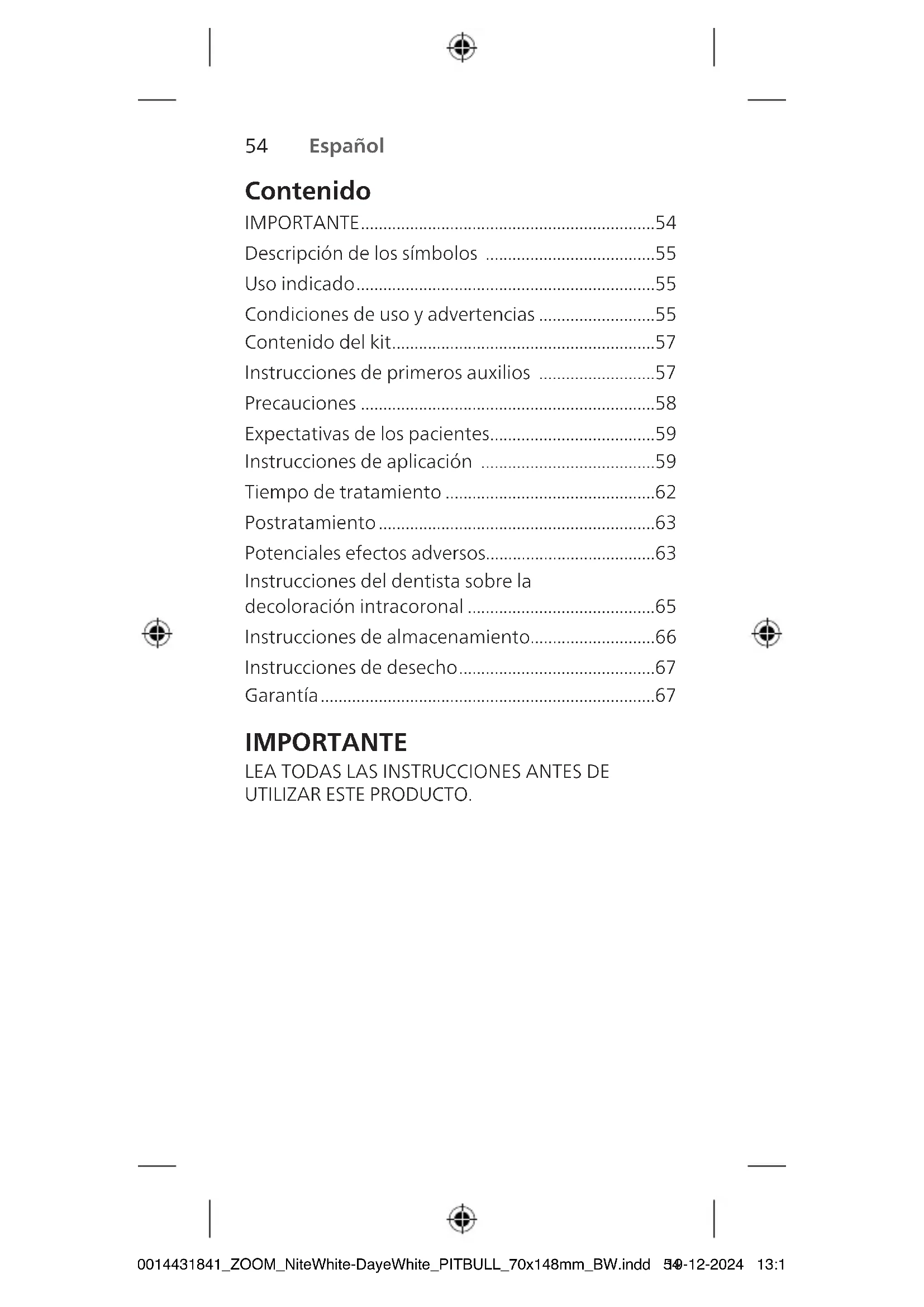 - UTILIZAR ESTE PRODUCTO. Descripción de los símbolos Consulte el manual de instrucciones de uso Mantener fuera del alcance de los niños Mantener alejado de fuentes de calor y la luz directa del sol. Temperatura de almacenamiento Período de validez después de la apertura Fecha de uso preferente Uso indicado Los kits de luces LED aceleradoras Philips Zoom! Los geles de blanqueamiento dental DayWhite/ NiteWhite son productos para el uso por parte de consumidores (en su domicilio) destinados al blanqueamiento de dientes naturales decolorados. Condiciones de uso y advertencias - No se debe utilizar este producto en pacientes con problemas bucales o de salud subyacentes. Antes de cualquier tratamiento de blanqueamiento se recomienda consultar con un dentista cualicado a n de asegurarse de que no haya problemas bucales o de salud en curso, que no haya caries y que todas las restauraciones estén intactas o bien selladas con materiales provisionales adecuados. 300014431841_ZOOM_NiteWhite-DayeWhite_PITBULL_70x148mm_BW.indd 54300014431841_ZOOM_NiteWhite-DayeWhite_PITBULL_70x148mm_BW.indd 5419-12-2024 13:1219-12-2024 13:12Español 55 54 Español Contenido IMPORTANTE p. 54